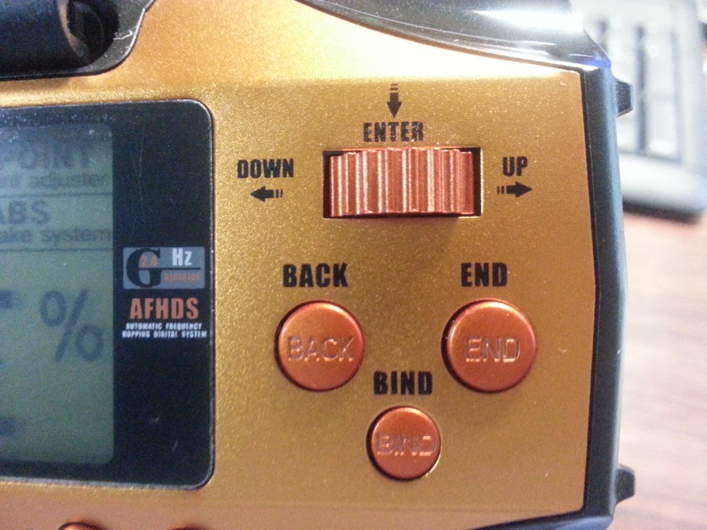 Zum Abschluss die Bauteile rechts vom Display. Ein Drehrad mit Tastenfunktion. Die Bezeichnung ENTER weißt den versierten Computernutzer auf eine wichtige Funktion hin, den Abschluss einer Aktion. DIE Taste überhaupt, bei der Parametrierung der Steuerung. Scrollen durch die Auswahlmenüs, nach links oder rechts, Auswahl bestätigen (kurz drücken) und Speichern (lang drücken). Darunter BACK, END und BIND. Schon die Namen weisen auf deren Funktion hin. Mit der BACK-Taste wird in den zuletzt aufgerufenen Menüpunkt zurückgesprungen. END beendet eine Aktion, in diesem Fall ohne Speicherung. BIND hat nur eine Funktion, die digitale Bindung von Sender und Empfänger nach der ersten Inbetriebnahme. Was vor langer Zeit mit identischen Quarzpaaren, die Identifizierung des Senders und seines zugehörigen Befehlsempfängers sicherstellte, erfolgt heute digital. Ohne diese Bindung würden Sender und Empfänger niemals zueinander finden und auch verbunden bleiben.