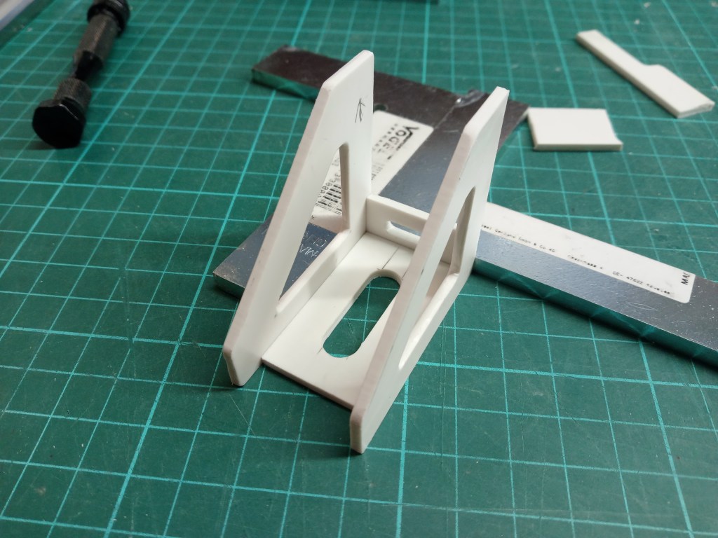 Die aktuelle Wetterlage; sehr hohe Luftfeuchtigkeit. Somit den Blick fest nach innen gerichtet und das war für die nächsten Bauschritt auch nötig. Aus zwei 2,5 mm starken PS-Platten, wurde im ersten Arbeitsschritt eine Aussparung herausgearbeitet, mit Koordinatentisch und Fräsmotor. Weniger dem Gewicht, als vielmehr der Optik geschuldet. Eine filigranere Optik sieht für mich einfach technischer und gleichzeitig auch schöner aus.