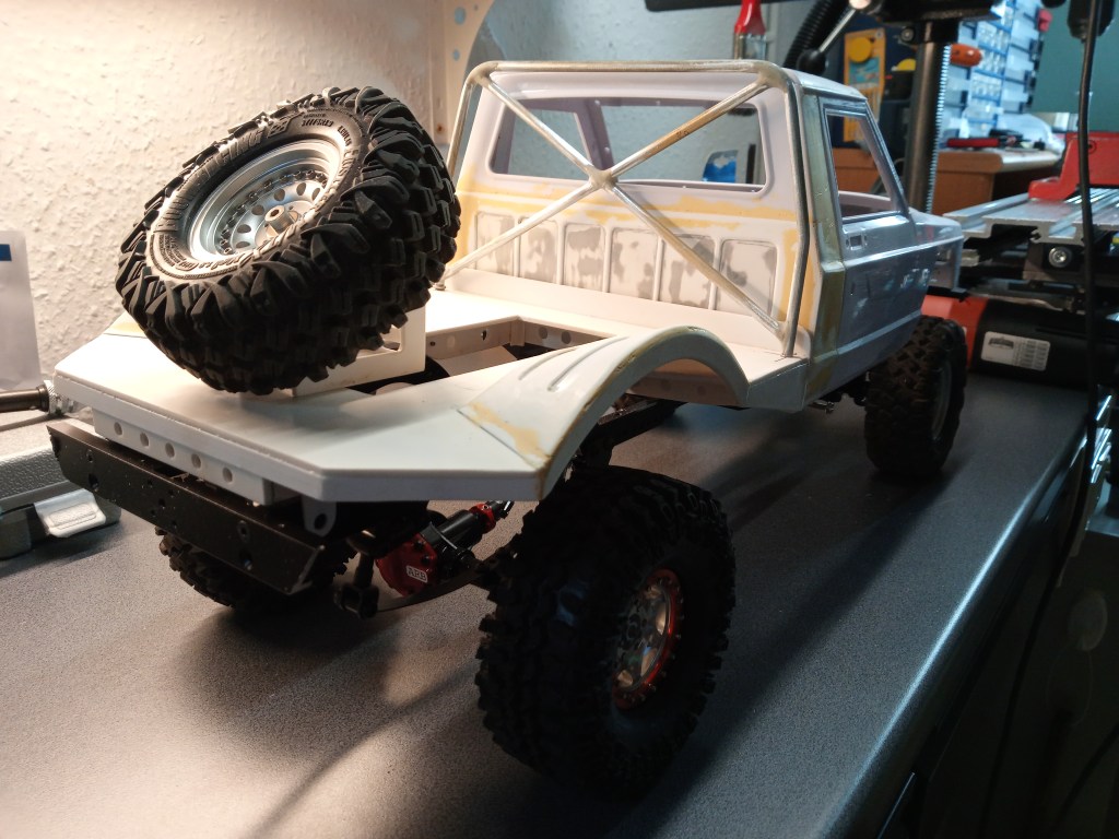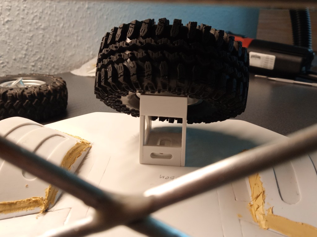 The two surfaces in the recesses, I had made with some material surcharge. Since I built the parts piece by piece, deviations in the tenth range are not excluded. What is left over is simply reworked. You can see the excess material on the actual mounting surface of the spare wheel.