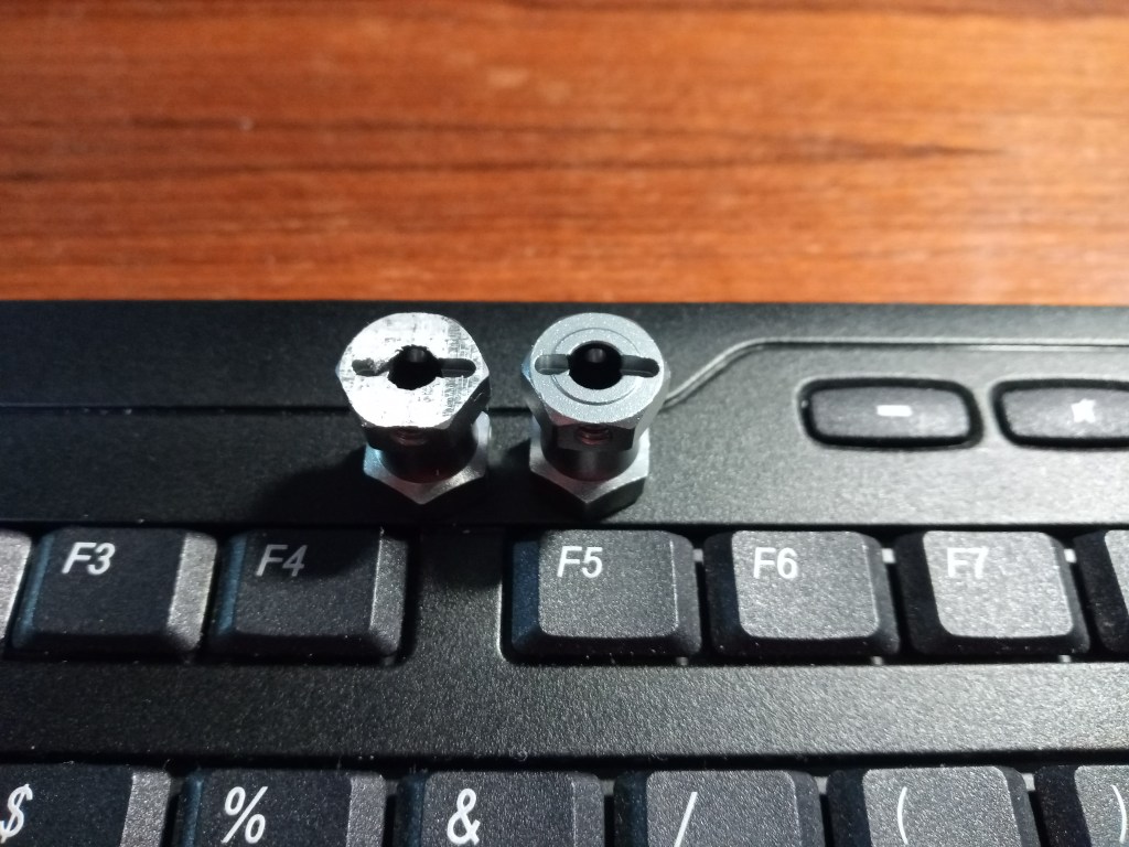Eine 19 mm breite Vierkant-Aufnahme von GPM, als Ersatzteil für einen Radträger des Axial Bomber RR10, wurde plan gefräst. Links das bearbeitete und rechts das Originalteil.