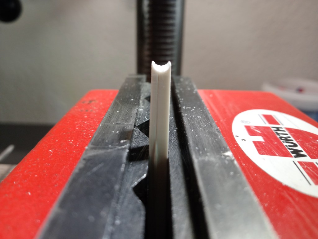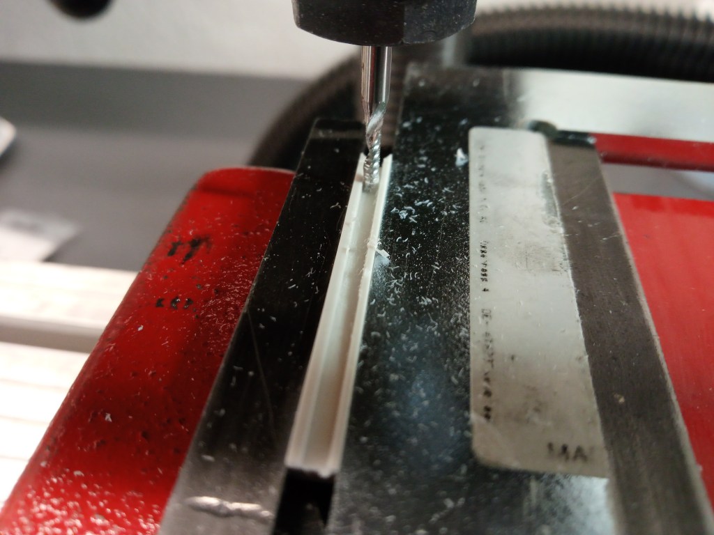 Soweit zum einfachen Teil der Minibaustelle. Schon ganz gut, aber noch völlig unförmig und unproportioniert. Um diese Ziel zu erreichen, wurde ein U-Profil etwas eingefräst. Ein guter Ansatz, wie ich im Nachhinein und auch zu meinem Glück eingestehen muss. Nachfolgend also das untere U-Profil, mit Ausformung der Mastkontur. Auf der nicht sichtbaren Rückseite, die zusätzliche Nut für das Kabel.