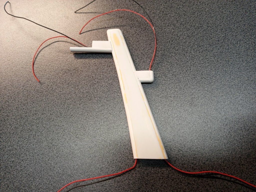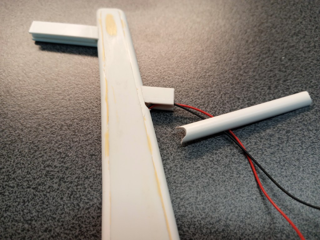After gluing the lower and front profile, on the right the finished result and on the left the intermediate step described above. Based on the picture, you can now also imagine the angled cable routing. On the right side of the profile, the cable leads to the hole in the direction of the boom. At its bottom side it goes to the right again and then upwards. Due to my generous design of the channels, the cable pair can still be moved with resistance. If I had routed the cable in the boom at the top, I would have been spared the last unnecessary change of direction. Theory and practice do not always lead to the same result.