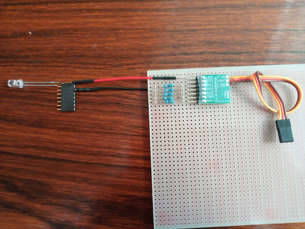 Die Ausgänge Out0, Out1, und Out2 sind die möglichen Schaltausgänge für LEDs. Sie schalten jeweils die Kathode, also Minus (-). An den Ausgängen Out3, +Batt und GND wäre in dieser Ausführung der direkte Anschluss eines Servos möglich. Im verlinkten Beitrag wird auch das Modul RCuniSwitch LED vorgestellt. Es hat am Ausgang Out3 eine zusätzliche Anschlussmöglichkeit für LEDs. Das Modul ist individuell programmierbar und ideal für Anfänger. Das große Anwendungsspektrum begeistert aber auch die Profis.