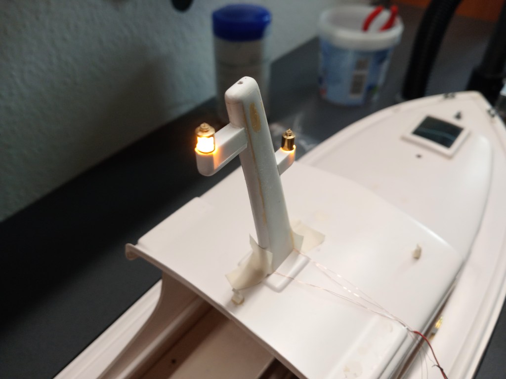 For the lighting I finally decided to use SMD LEDs with soldered enamelled copper wire. They are thin enough that they could be soldered to the routed cables and pulled in. They can be seen at the bottom of the mast.
