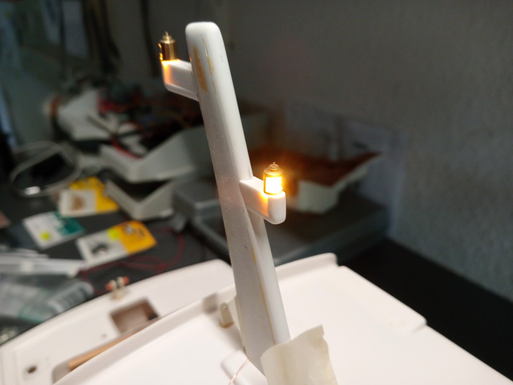 Für die Beleuchtung habe ich mich letztlich noch zum Einsatz von SMD-LEDs mit angelötetem Kupferlackdraht entschieden. Die sind so dünn, dass sie an den verlegten Kabeln angelötet und eingezogen werden konnten. Sie sind am unteren Ende des Mastes erkennbar.
