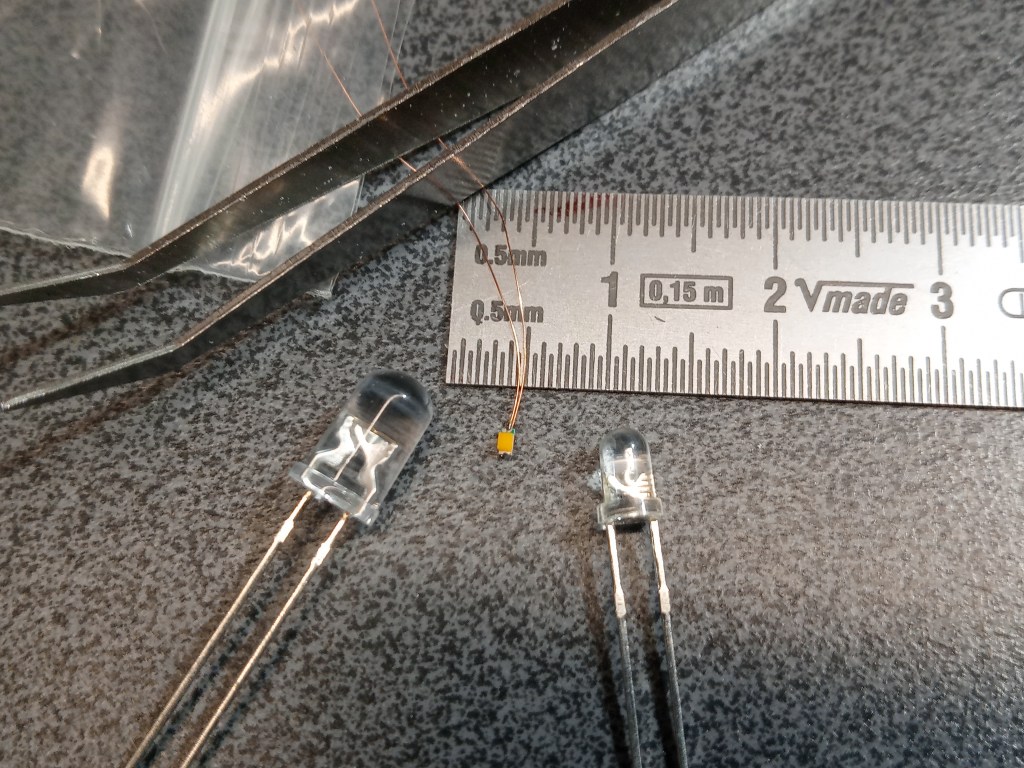 Zum Abschluss noch ein Größenvergleich der SMD LED (Mitte) mit Standard 3 und 5 mm LEDs.