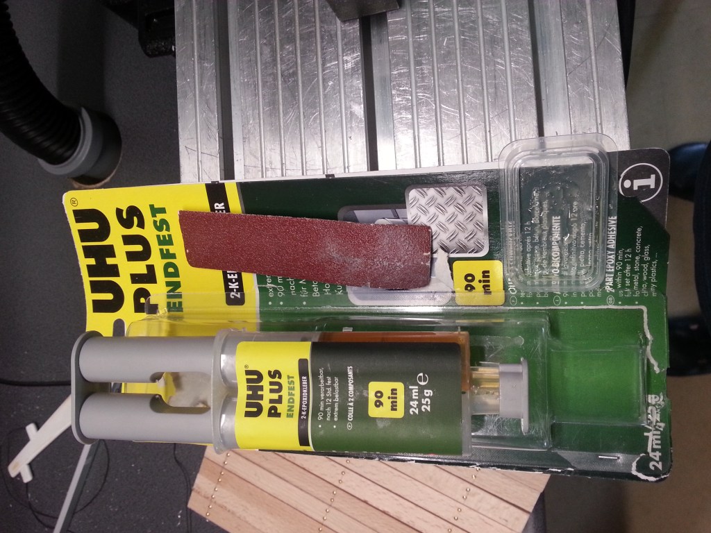 Für sämtliche Verklebungen wurde Uhu Plus endfest verwendet. Über die interaktive Klebeberatung auf der Internetseite von UHU kam ich zu diesem Kleber. Unter Beachtung der Klebevorgaben, anschleifen mit dem beigefügten Schmirgelleinen, entstauben und entfetten, sind bisher alle Klebungen gelungen. Überstehende Klebereste lassen sind nach der mindestens 12-stündigen Aushärtezeit, mechanisch entfernen.