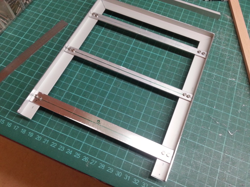 After drilling and screwing the crossbars now the following picture. For the first time a stable and now also in the width fitting component. Building in aluminum requires a little more effort. The inner corners were sawed out and bent at the corner. Steel screws M2 connect the parts. Later, rust will form on it due to moisture, to make the handcart look realistic 😉.