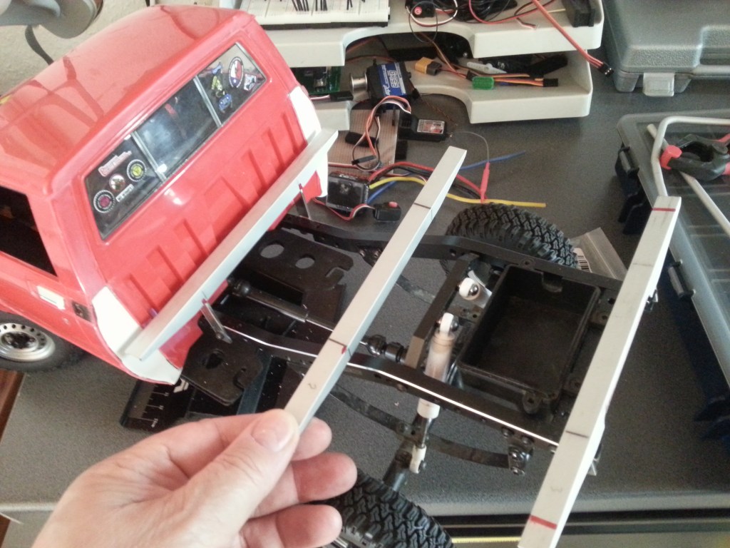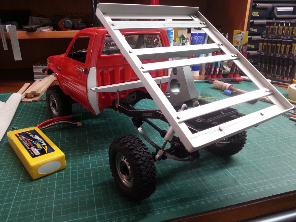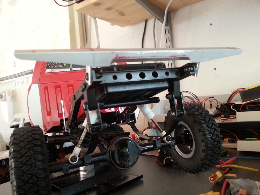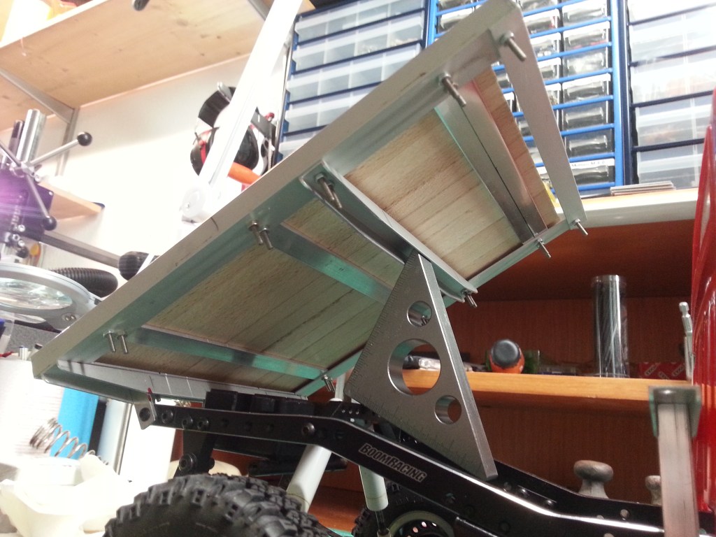 Jetzt liegt alles auf einer Ebene und könnte theoretisch befestigt werden. Die Ladefläche wiegt so schon 250 Gramm, die das vorläufige Gesamtgewicht des Toyota auf 3,1 kg bringen. Das gefällt mir und wird das Fahrwerk schön zum Arbeiten bringen. Und noch sind kein Reserverad und die obligatorischen Zusatzteile an Bord.