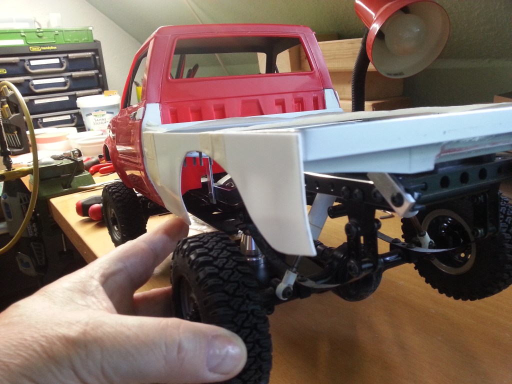 Vor den Radkästen wird eine Trennwand das Akkufach begrenzen. Zunächst noch durchgängig. Daneben der noch unbearbeitete Heckabschluss mit den nur aufgelegten Beleuchtungselementen.