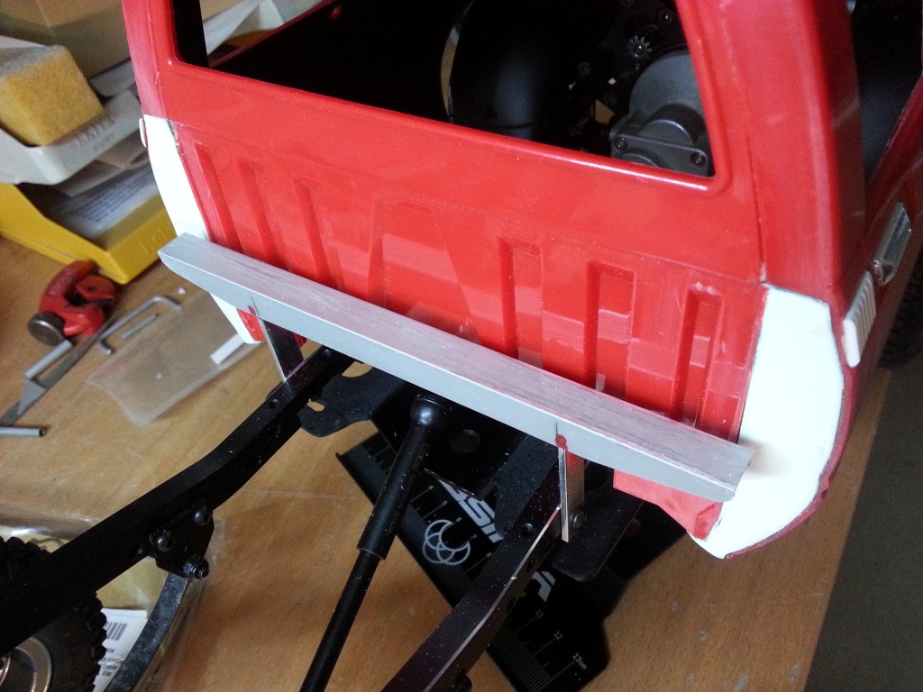 Damit auch eine Befestigungsmöglichkeit für das Nummernschild vorhanden ist, gab es noch den passenden Hintergrund. Darunter kommt noch, am Fahrzeugrahmen befestigt, eine gerade Stoßstange aus robustem Aluminiumrohr.