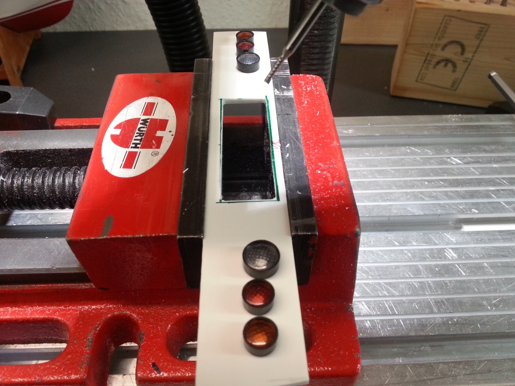 Vorab aber einen Sprung zur Rückseite der Ladefläche. Oben war ja schon das Rohteil des Heckabschlusses zu sehen. In dreistündiger Filigranarbeit wurden die Lampengehäuse vermessen, auf dem Heck angeordnet und befestigt. Dabei durfte auch der Koordinatentisch wieder seine Leistungsfähigkeit zeigen. Eine Aussparung für das Kennzeichen wurde ausgefräst und eine Fase angelegt.