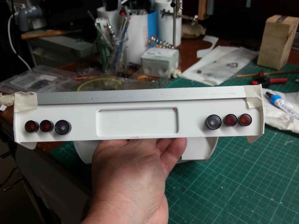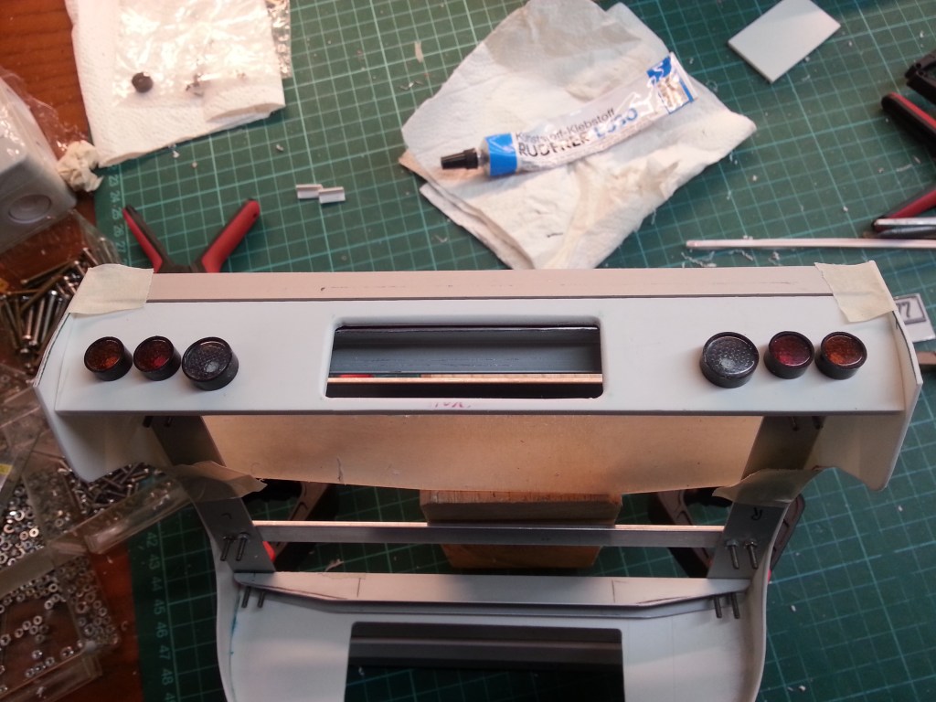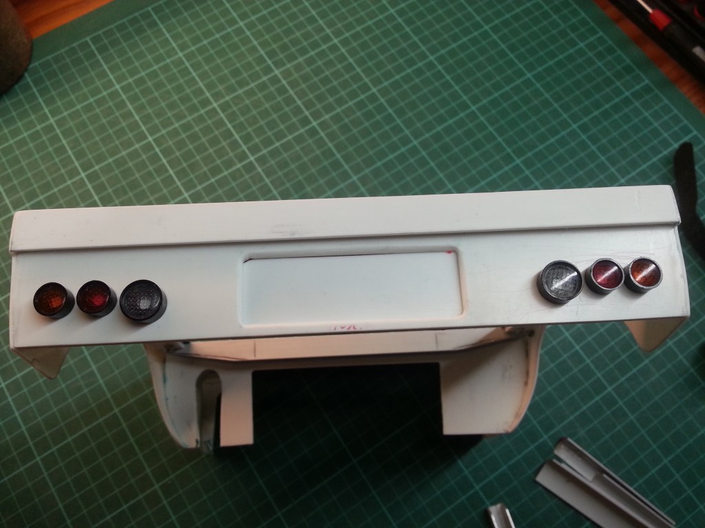 Die Rücklichter sind schon einmal befestigt, aber noch sind keine Bohrungen für die LEDs vorhanden. Auch bis auf weiteres zurückgestellt.