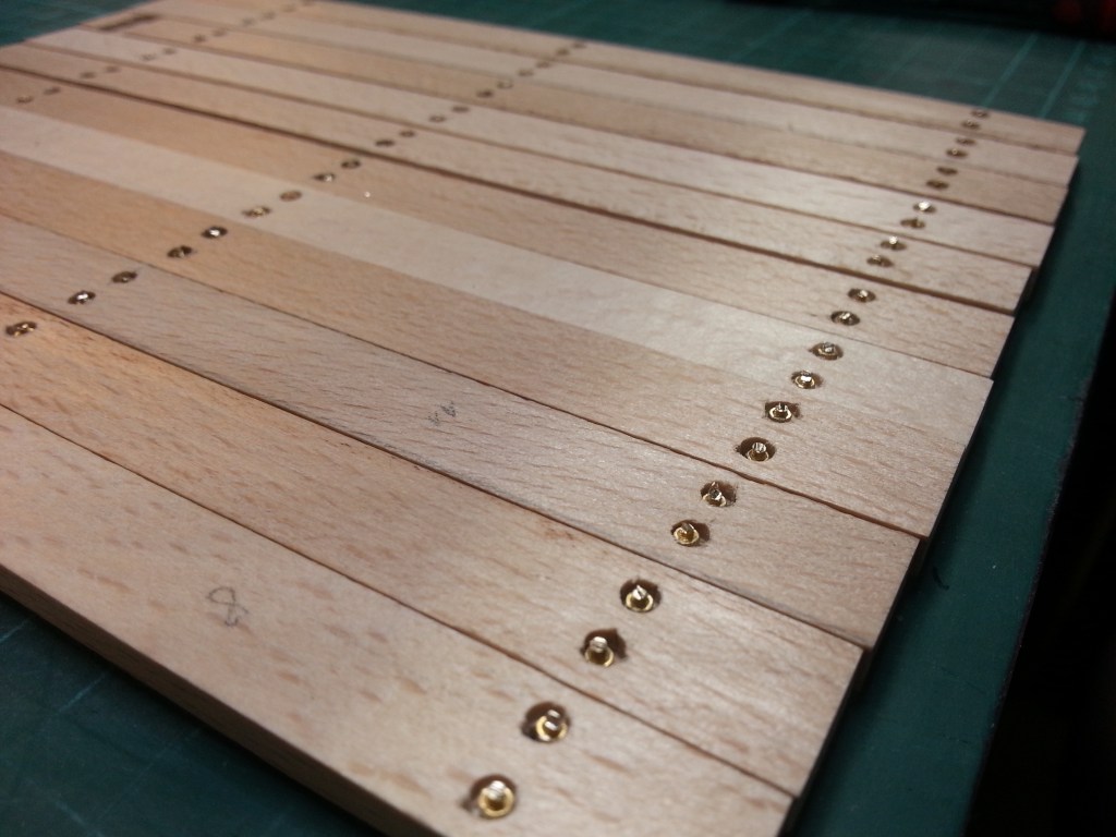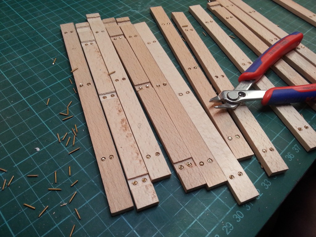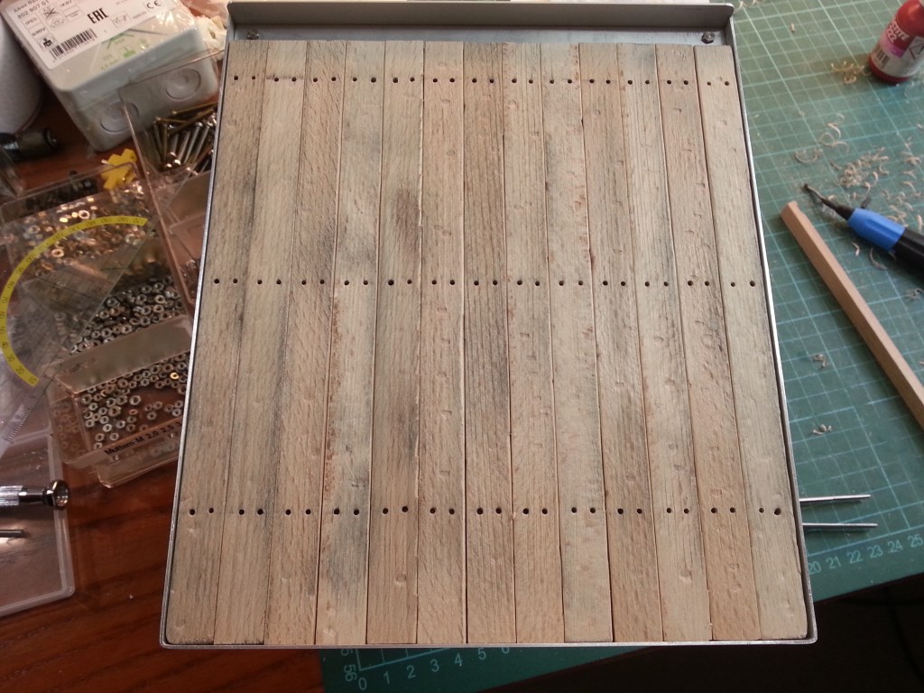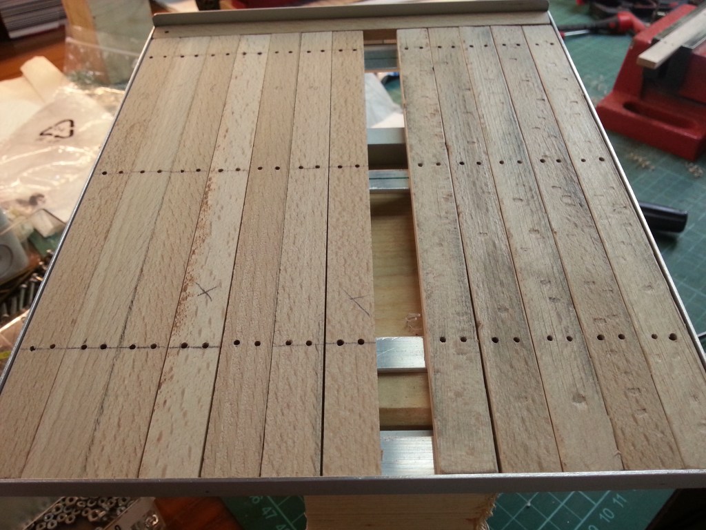 At the same time, work continued on the loading area floor. A very exhausting job, but one after the other. From the original plan to screw the planks directly to the frame, I got away. I didn’t want to work with these small nuts in cramped conditions. But the optics should remain unchanged. So on the underside 3 mm blind holes were drilled. So big that the socket wrench still fits in and the nut disappears flush in it.