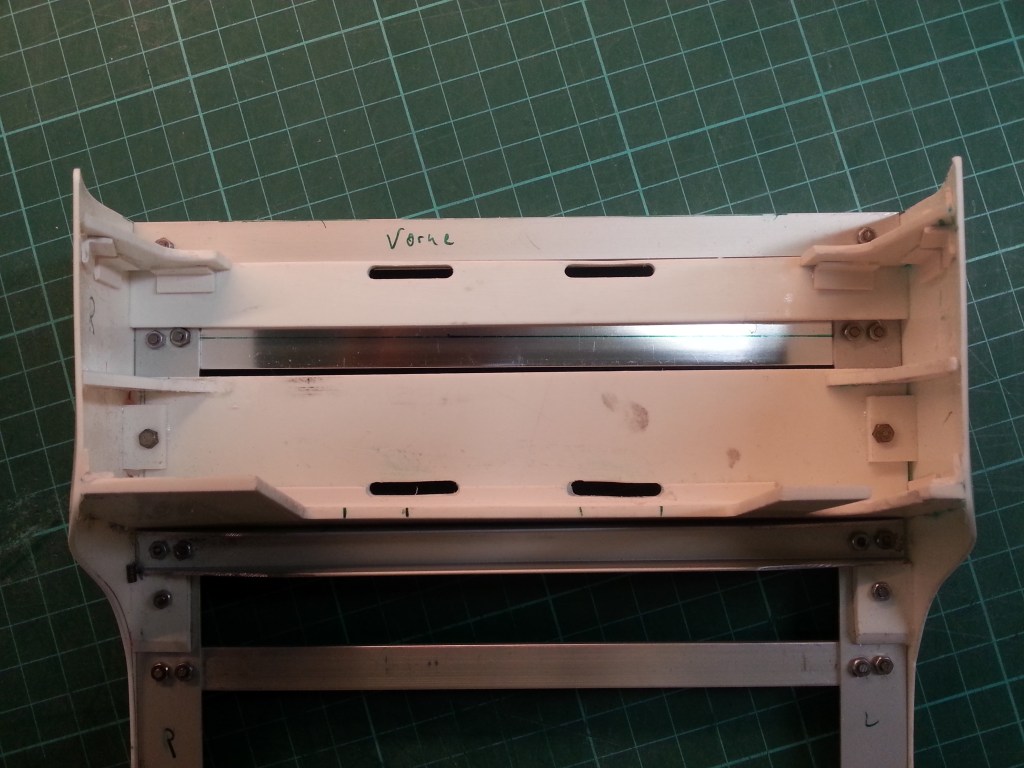 Ursprünglich war die Fixierungen der Ladefläche, auf dem vorderen Auflager, weit außen angebracht. Durch die nach unten zulaufende Seitenschürze, wurde hier aber eine Änderung erforderlich. Der Auflieger war zu breit und musste gekürzt werden. Gesagt, getan, hier die Vorher-Nachher-Bilder. Einen Zentimeter beiderseits gekürzt und es klappte.