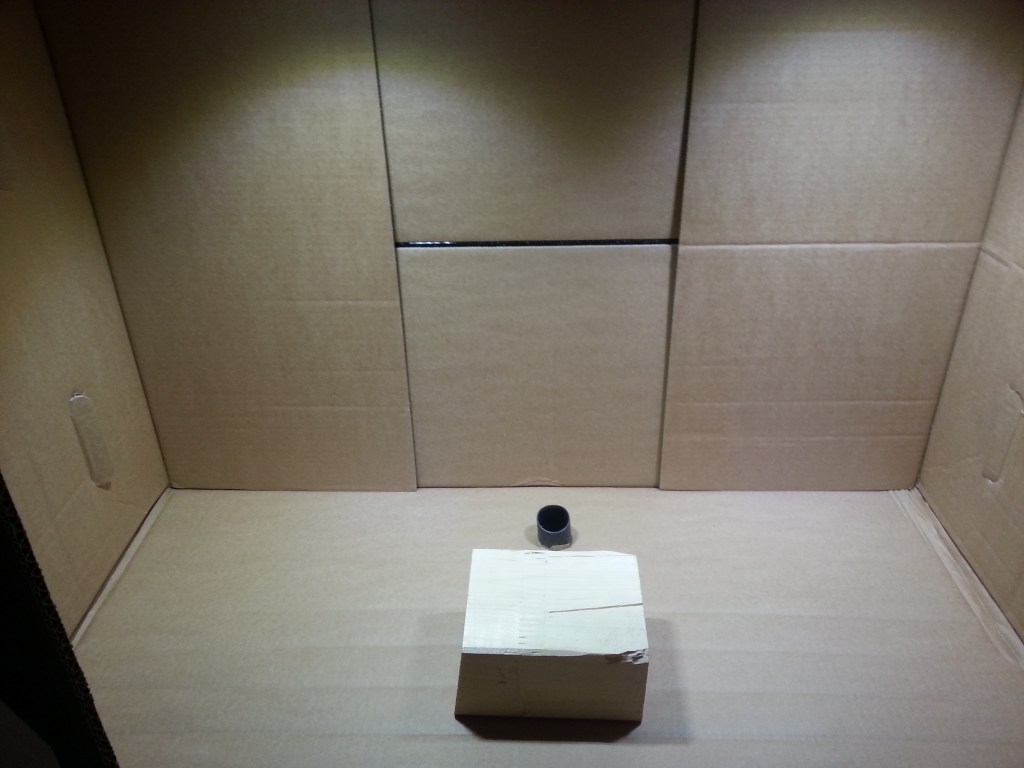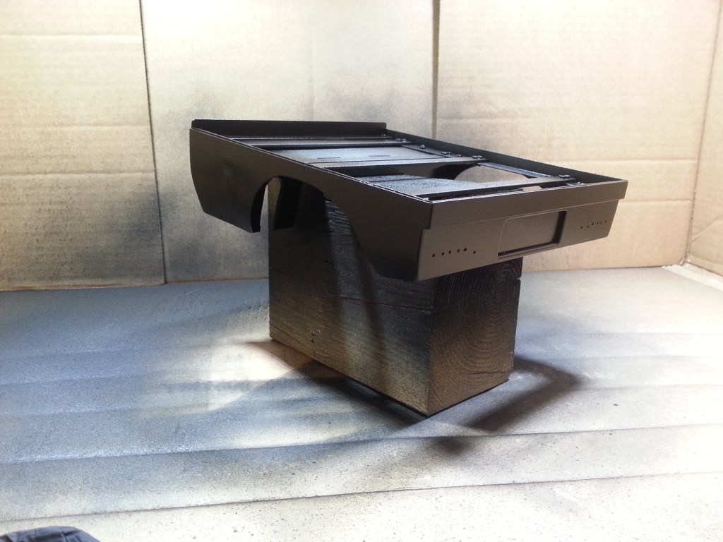 Nach dem finalen Feinschliff, der Reinigung und Entfettung ging es dann in die selbstgebaute Lackierkabine. Ein passender Karton wurde oben mit zwei Löchern versehen, in denen zwei meiner Akkuleuchten, Licht spenden. Mein Werkstattsauger diente als Absaugung für den Sprühnebel und hat sich als mehr als wacker geschlagen. Jetzt muss alles trocknen…