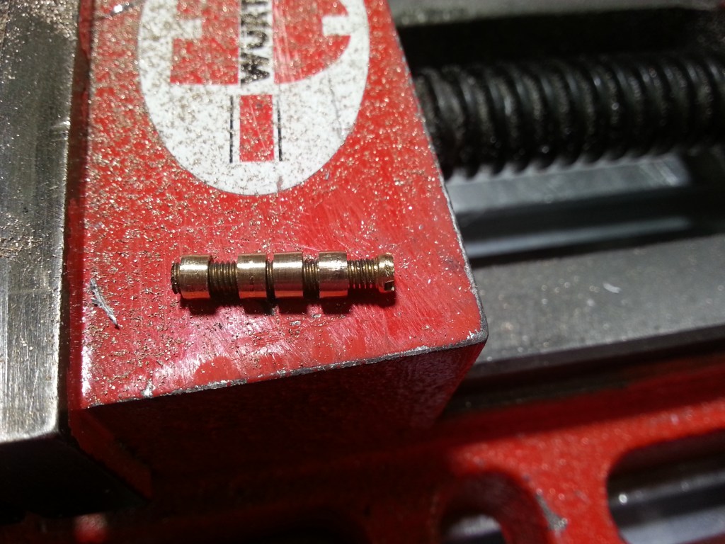 So startete mein Versuch. Vier Messingmuttern M3 wurden auf eine Schraube komplett aufgeschraubt. Das überstehende Gewinde in die Bohrmaschine eingespannt und die Muttern schrittweise mit Feile und Schmirgelpapier auf ca. 4,1 mm abgetragen. Der Aluminiumbügel mit einem 4 mm Bohrer auf Maß gebracht.