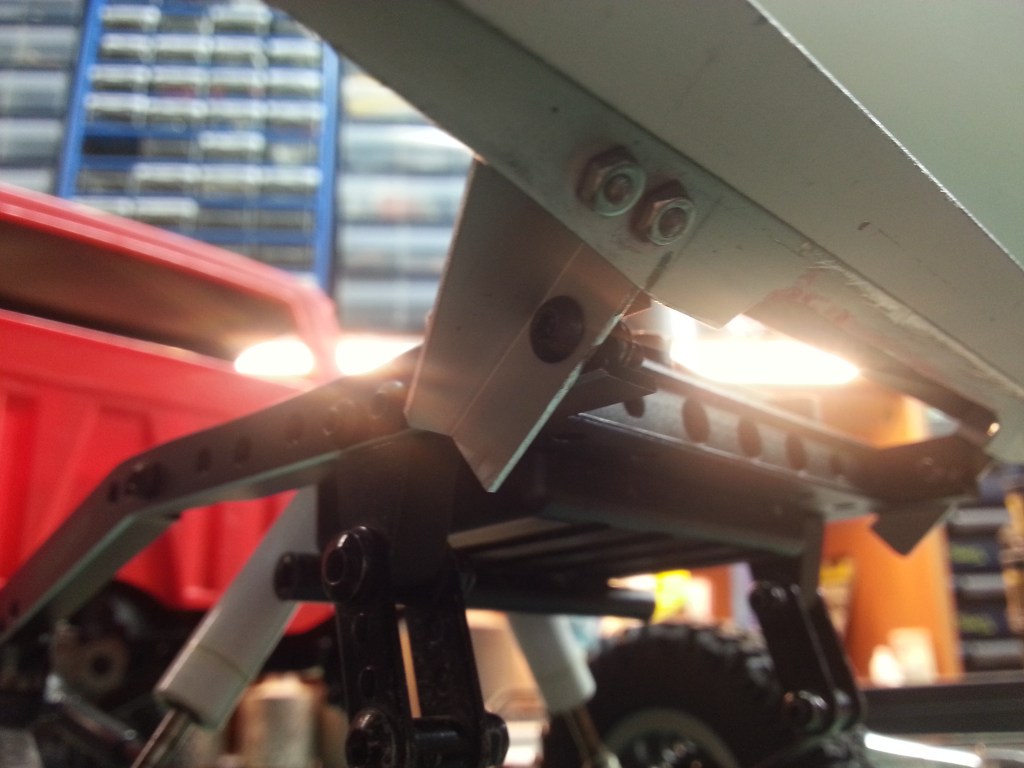 Das wichtigste für mich, die Halterung des Ladeflächendrehpunktes und das vordere Auflager wurden noch einmal komplett neu gebaut. Aus optischen Gründen, aber auch die Stabilität genügte nicht meinen Erwartungen. Gleichzeitig hat die hintere Halterung nun auch einen Anschlag integriert. Vorher klappte die Ladefläche so weit nach hinten, bis die Rückwand mit dem Rahmen kollidierte. Im schlechtesten Fall würde dieser beschädigt. Meine neue Variante verhindert das erfolgreich. Der überstehende Schraubenkopf der hinteren Rahmentraverse, beschränkt nun den Bewegungsraum.