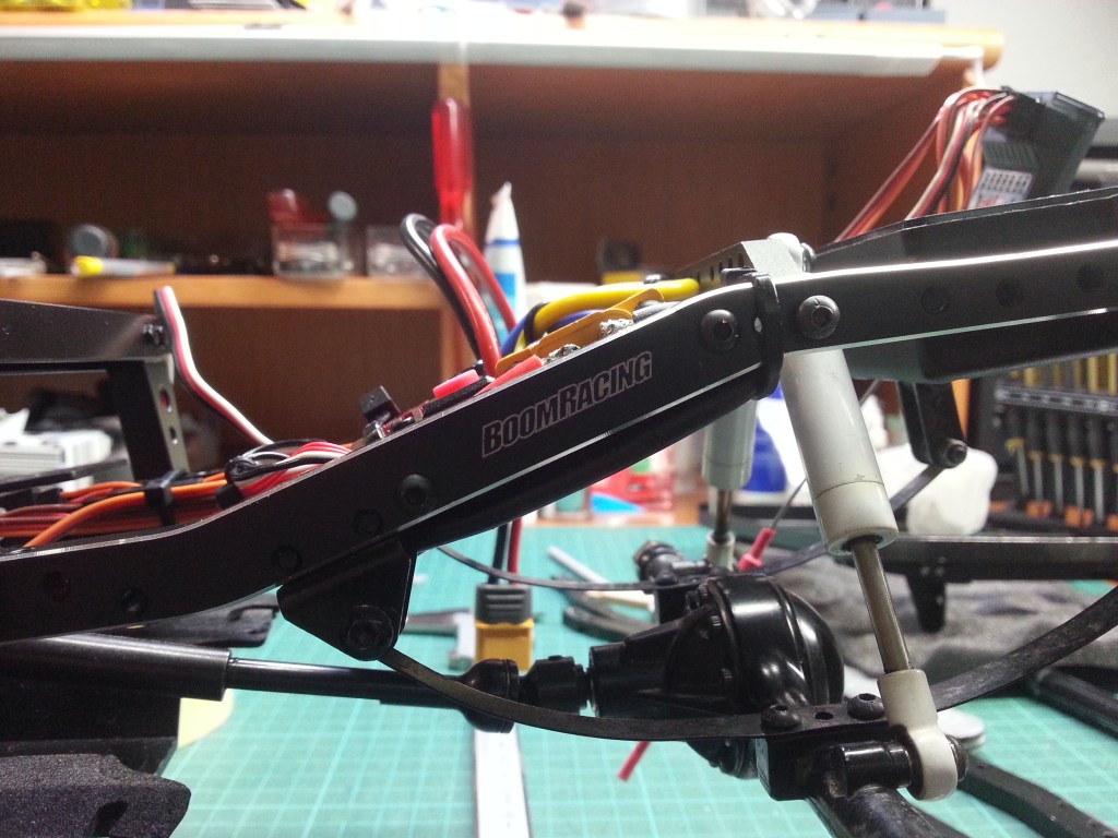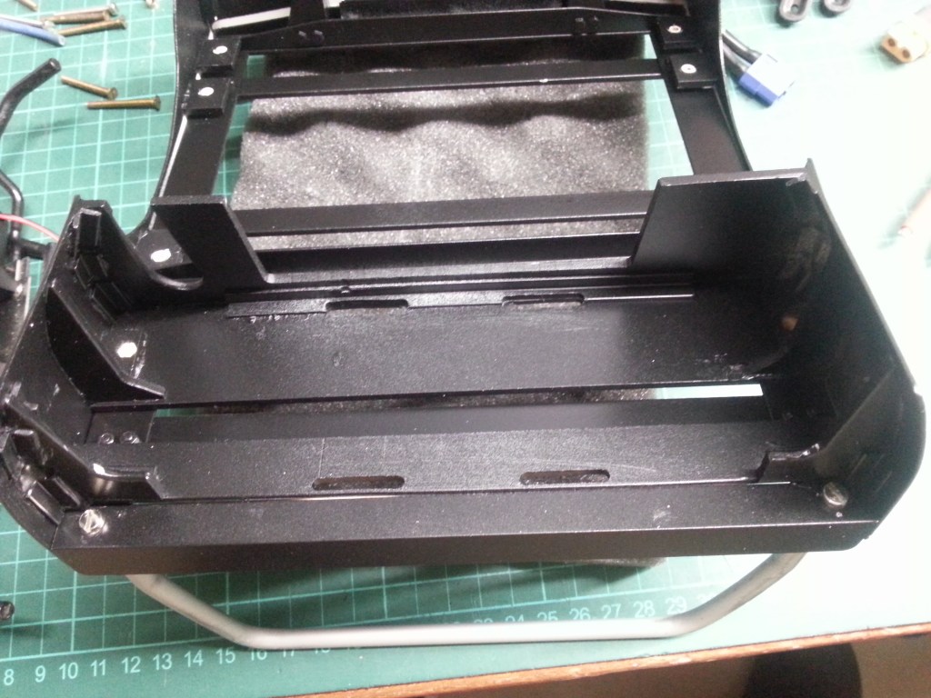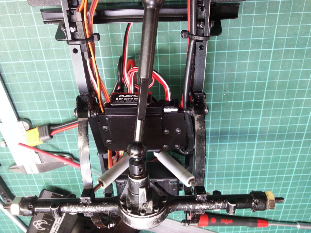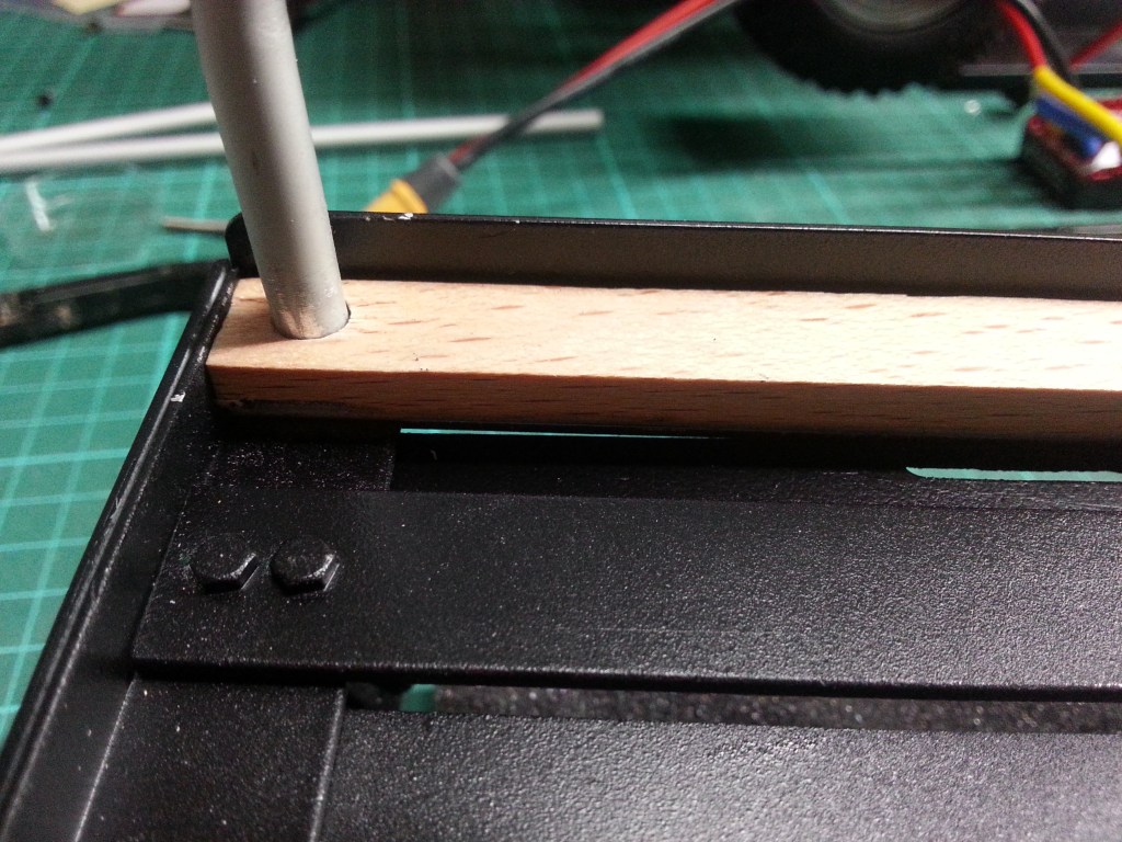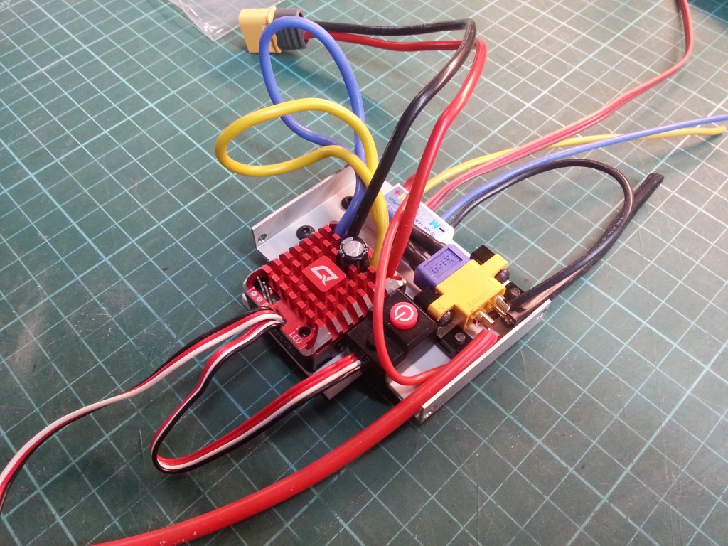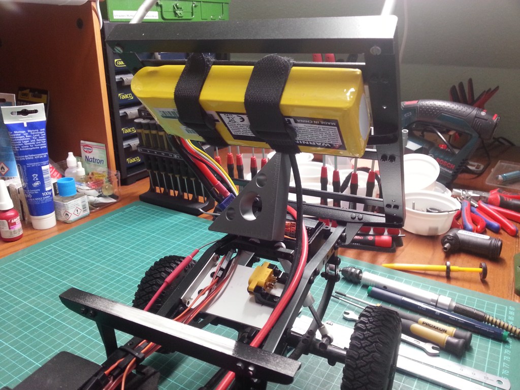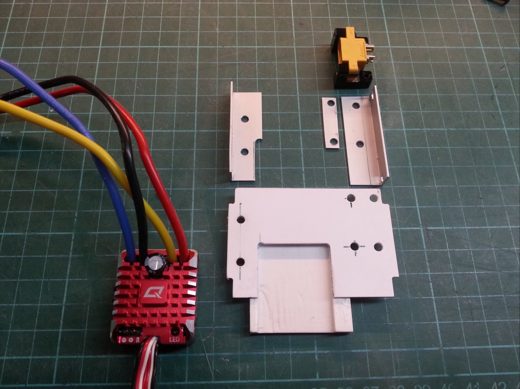 Die Montage des Fahrtreglers war unter der Ladefläche vorgesehen, unmittelbar vor der Dämpferbrücke. Dazu wurden zwei Aluwinkel, eine Platte aus Kunststoff hergestellt und zwischen den Rahmenelementen verschraubt.