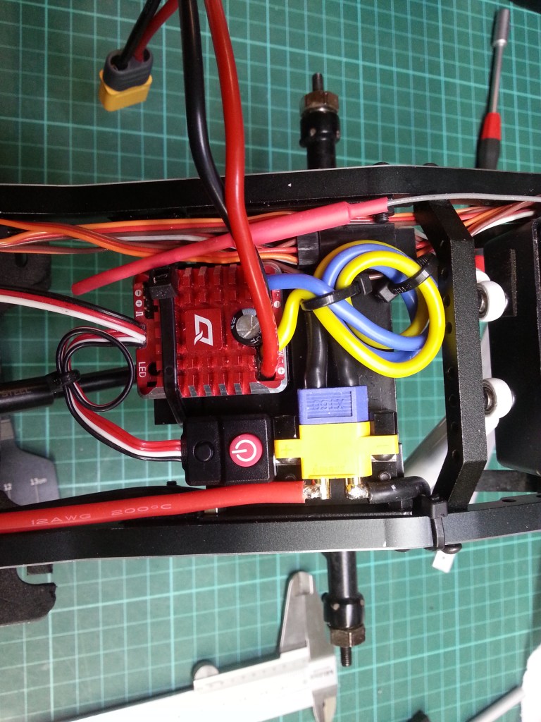 Here you can see how cramped the space is. Everything was mounted on a trial basis. On the right side are the positive and negative wires to the motor. The power supply of the Thor controller for the winch is connected in parallel. The speed controller is connected via this connector, yellow and blue, top left in the picture. The two thick, red-black cables end in an XT60 socket, which is connected to the drive battery. The pair of blue and yellow cables on the top right is used to supply power to the winch. The left and right outgoing 3-core cables are the supply cables to the receiver. On the top right the winch control and on the left the speed controller with the corresponding on-off switch.