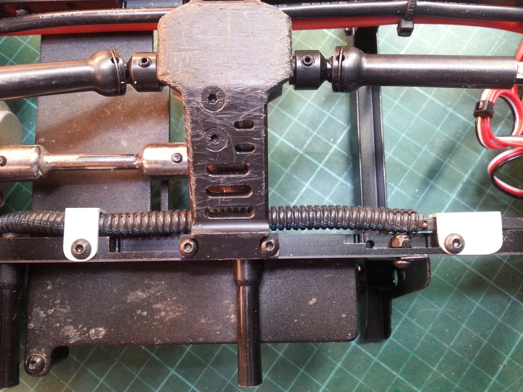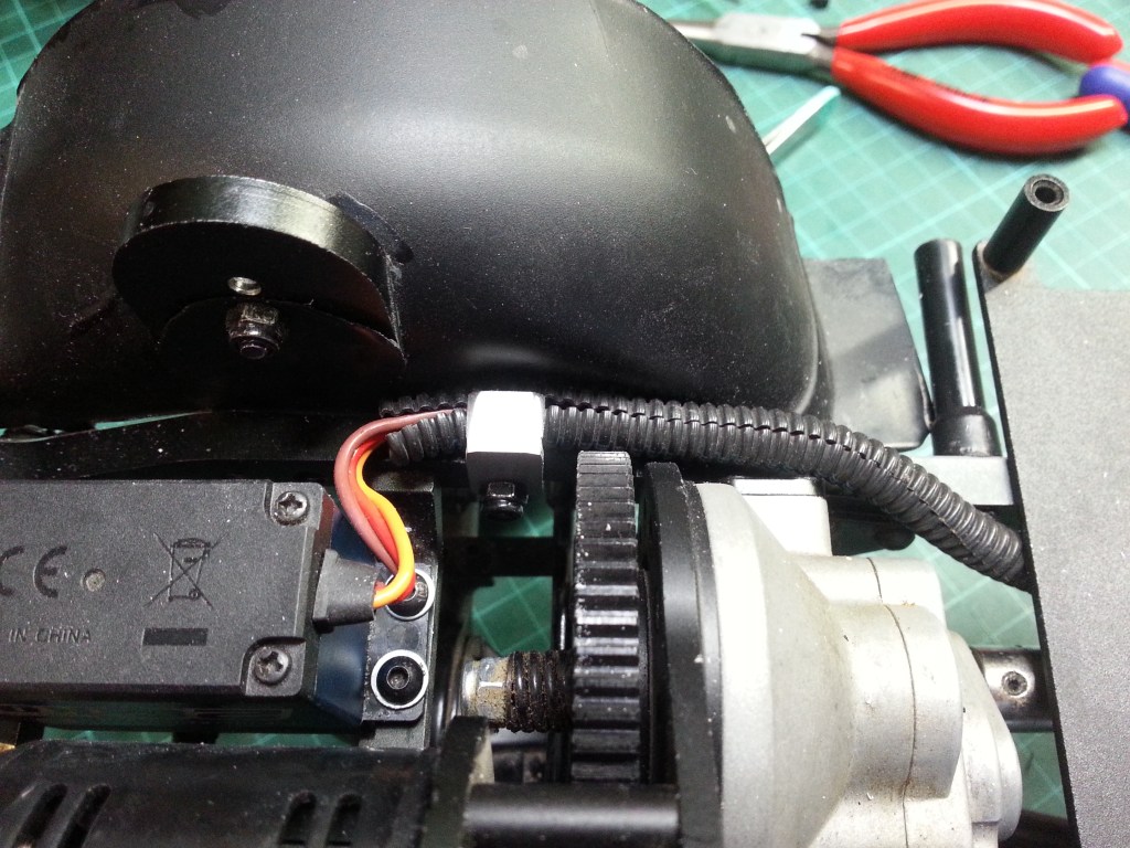 Für die Kabelführung des Lenkservos habe ich dann aus Resten von Aluminiumwinkelstücken noch einige Halterungen hergestellt. Besonders zwischen dem Innen-Kotflügel und dem Zahnrad geht es sehr eng zu.