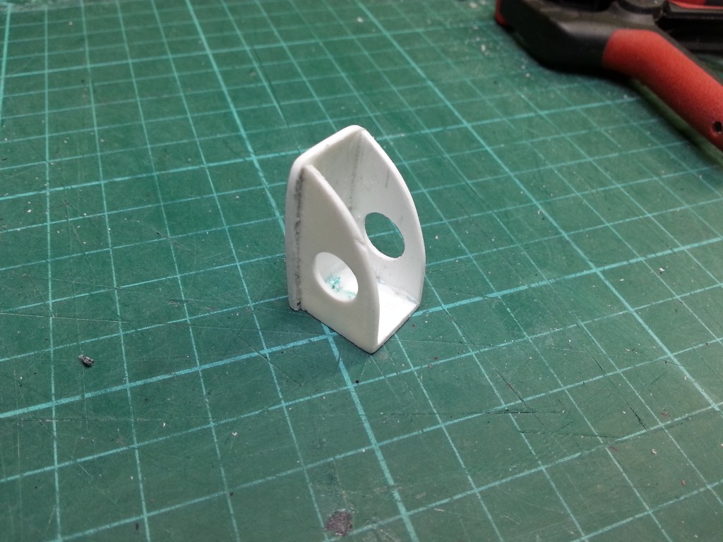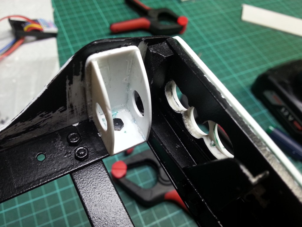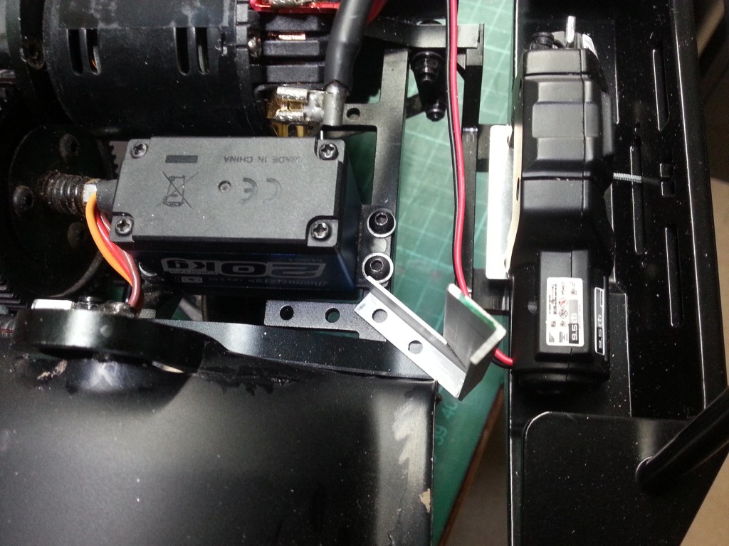 So sehe die Einzelteile vor der Montage und Lackierung aus. Am Winkel des zweckentfremdeten Servohalters gab es auch noch eine Modifikation. Die Buchse wurde nun auf der Innenseite befestigt und dazu der Winkel etwas ausgefräst. Somit wird die Einheit mehr Richtung Rahmen wandern und etwas mehr Platz auf der Ablage zur Verfügung stehen.