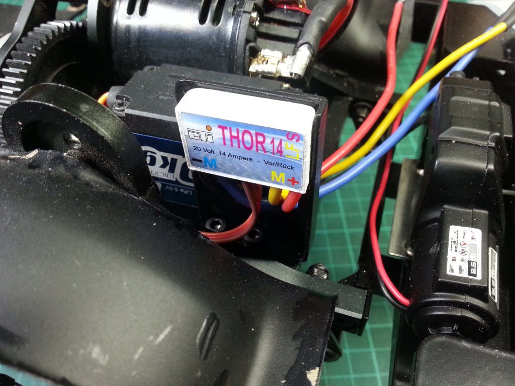 Nachdem alle notwendigen Teile verkabelt wurden, gab es eine erste Probefahrt des Fahrgestells. Es funktionierte alles wie erwartet. Nun zum Anschluss der Seilwinde. Zur Windensteuerung wurde der Regler Thor 14s der Firma CTI eingesetzt. Er ist ca. 23x14x6 mm klein. Daher wird er im Vorderwagen und dort in unmittelbarer Nähe der Winde montiert. Der Montageplatz am Rahmen machte wieder etwas Arbeit. Ein abgewinkelter Rest des Ladeflächen-Unterbaus wurde dazu modifiziert. Zwei Bohrungen halten den Winkel auf einem nicht benötigten Trägerarm des Lenkservos.