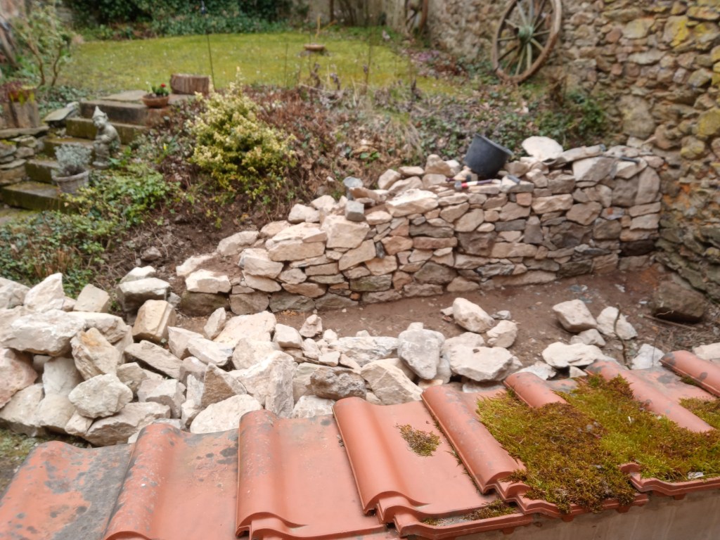Das alles für einen ungestörten Blick auf eine weitere Baustelle, meine Trockenmauer aus alten Bruchsteinen. Im Vordergrund die nun größtenteils nicht mehr existierende Mauer