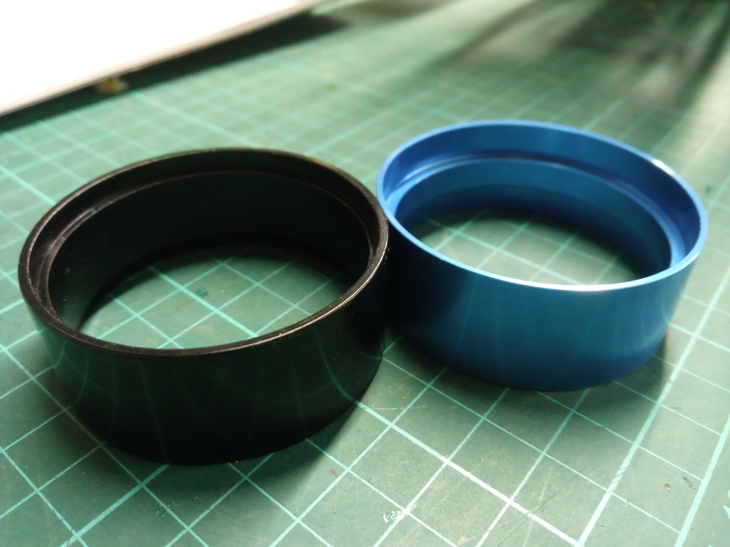 Genau hier zeige ich nun das Problem bei Verwendung, des zur Felge gehörenden schwarzen Stahl-Innenringes. Zur Ansicht einmal die augenscheinlichste Erkenntnis. Die Abstufung beim schwarzen Originalring ist 3 mm tief, beim blauen ist er hingegen 5 mm tief. Um ein Problem daraus erkennen zu können, muss man die Breite der auf Bild 9 gezeigten RC4WD-Gummiwülste kennen, nämlich 5 mm.