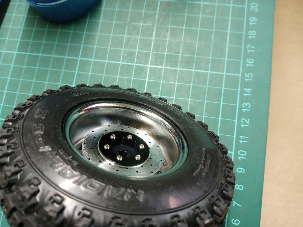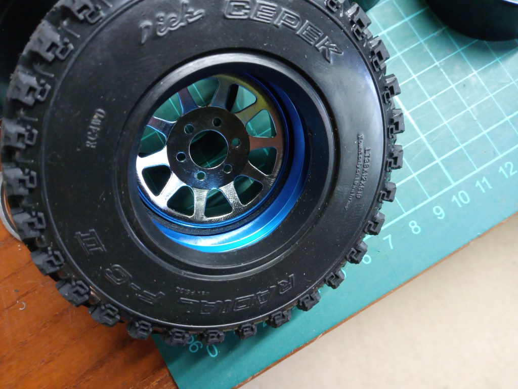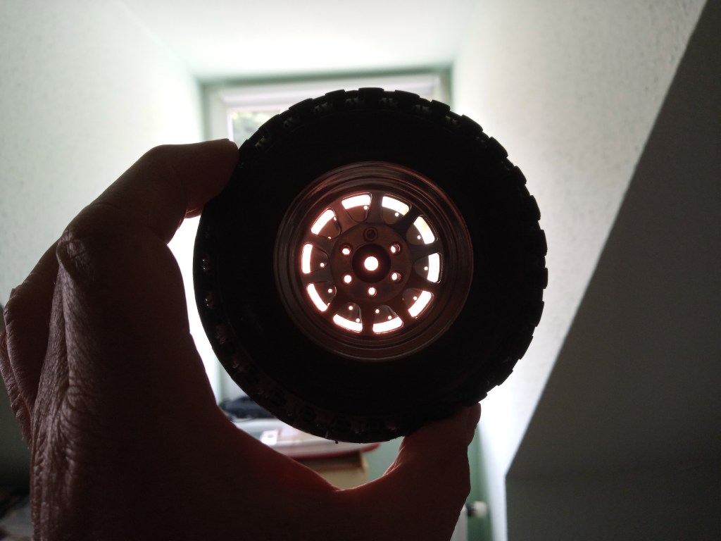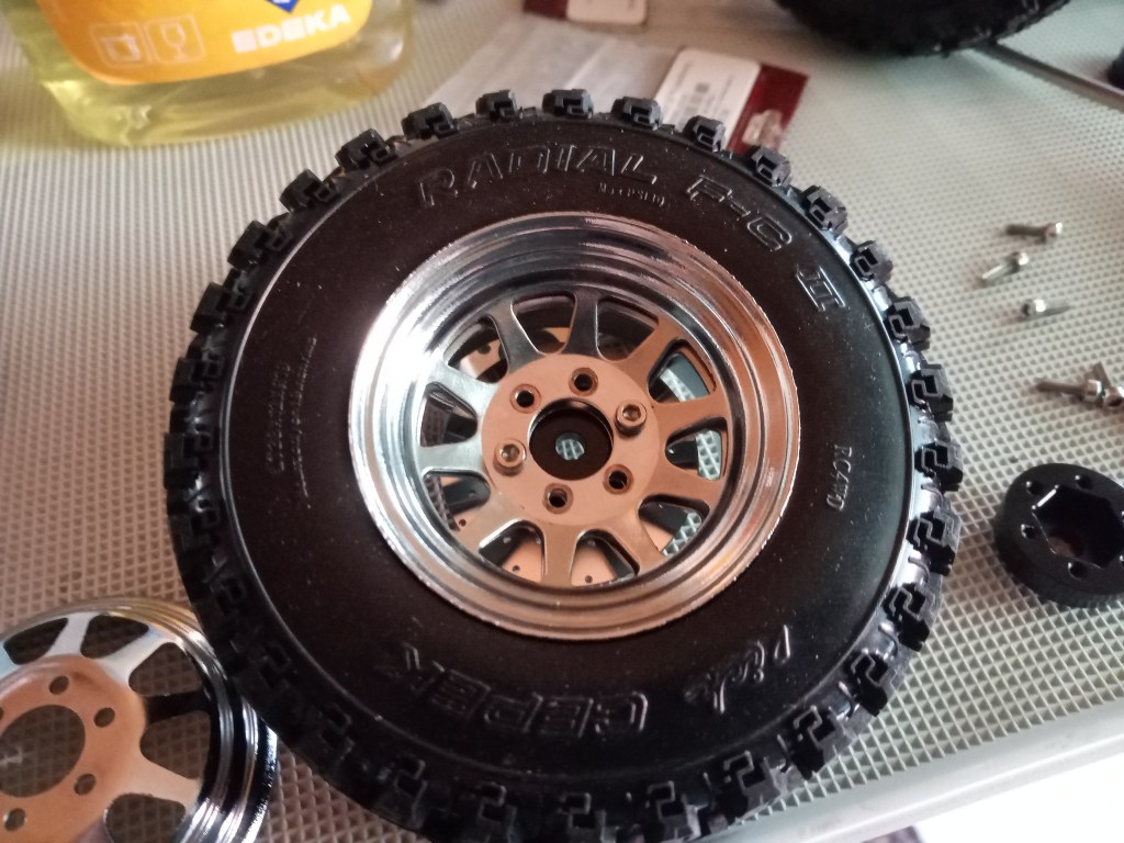 First driving tests with the kit wheels on the chrome rims, both in 1.9 inch were ended prematurely. Little to no traction, was no basis for further road tests. So back to searching and reordering. The choice of 1.7 inch tyres is very clear. Since the outer diameter had to stay well below 100 mm, the choice fell on very soft Dick Cepek Trail Country from RC4WD. I can say it in advance, a very good tyre on dry and also stony ground. Visually, they are also a feast for the eyes.
