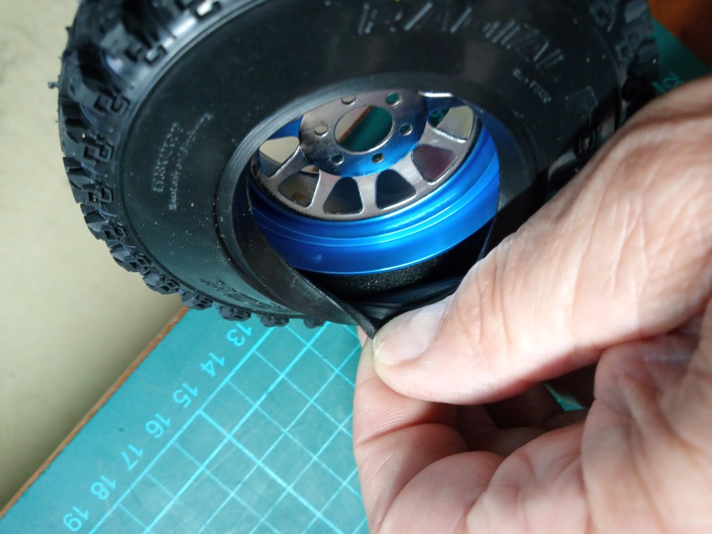 In der Praxis gibt es aber noch einen weiteren Unterschied, der über die Tiefe des ausgedrehten Randes hinausgeht. Beim blauen Alu-Beadlock-Ring ist die Ausdrehung ca. 1,7 mm im Durchmesser größer, als beim schwarzen Stahl-Ring. Das könnte in der Praxis bei schweren Fahrzeugen und extremen Winkeln zum durchrutschen oder auch ausziehen des Gummilwulstes führen. Genau das ist bei mir passiert, hat aber vermutlich andere Ursachen, die ich nachfolgend zu beschreibe versuche. Ich werde aber dennoch weitere Test machen, um die Auswirkungen fundiert zu beschreiben. Im Übrigen möchte ich auch nicht unterschlagen, dass RC4WD die blauen Ringe anbietet, um Proline-Reifen auf RC4WD-Felgen zu montieren!! Meine Interpretation und auch Schlussfolgerungen sind also mit gewisser Vorsicht zu genießen.