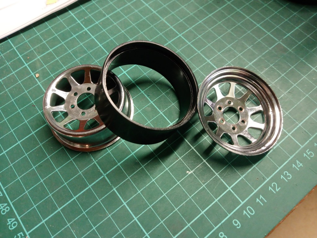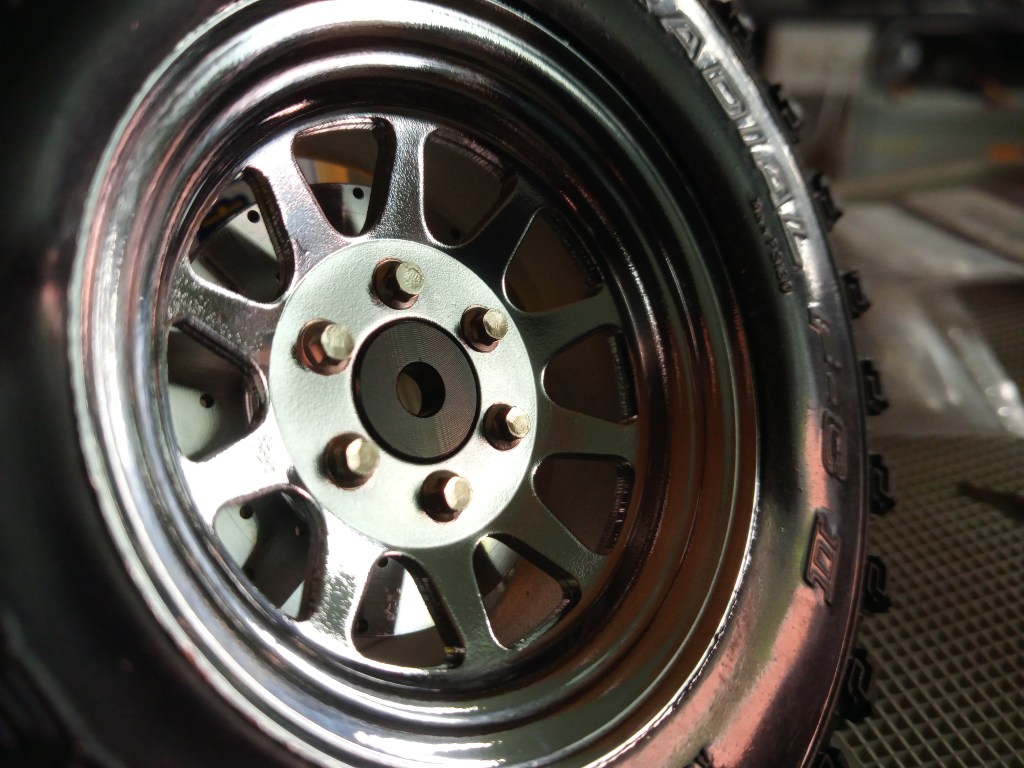 Schließlich noch die Chromfelgen, für die ich RC4WD Dick Cepek F-C II Gummis ausgewählt hatte. Sie sind geringfügig größer im Außenmaß aber auch schmäler als die Trail Country. Auch dieser Reifen erzielte auf meinem aktuellen Gartenparcours ein mehr als befriedigendes Ergebnis. Traktionstechnisch und auch im Hinblick auf die Proportionen ist der 1.7 Zoll Radsatz der Favorit. Wäre da nicht das gesteckte Ziel eines Jeeps in klassischer Edeloptik. Eine gedeckte Lackierung und viel kontrastierende silberne und chromglänzende Anbauteile sehe ich vor meinem Auge. Das schreit doch geradezu nach Chromfelgen!?