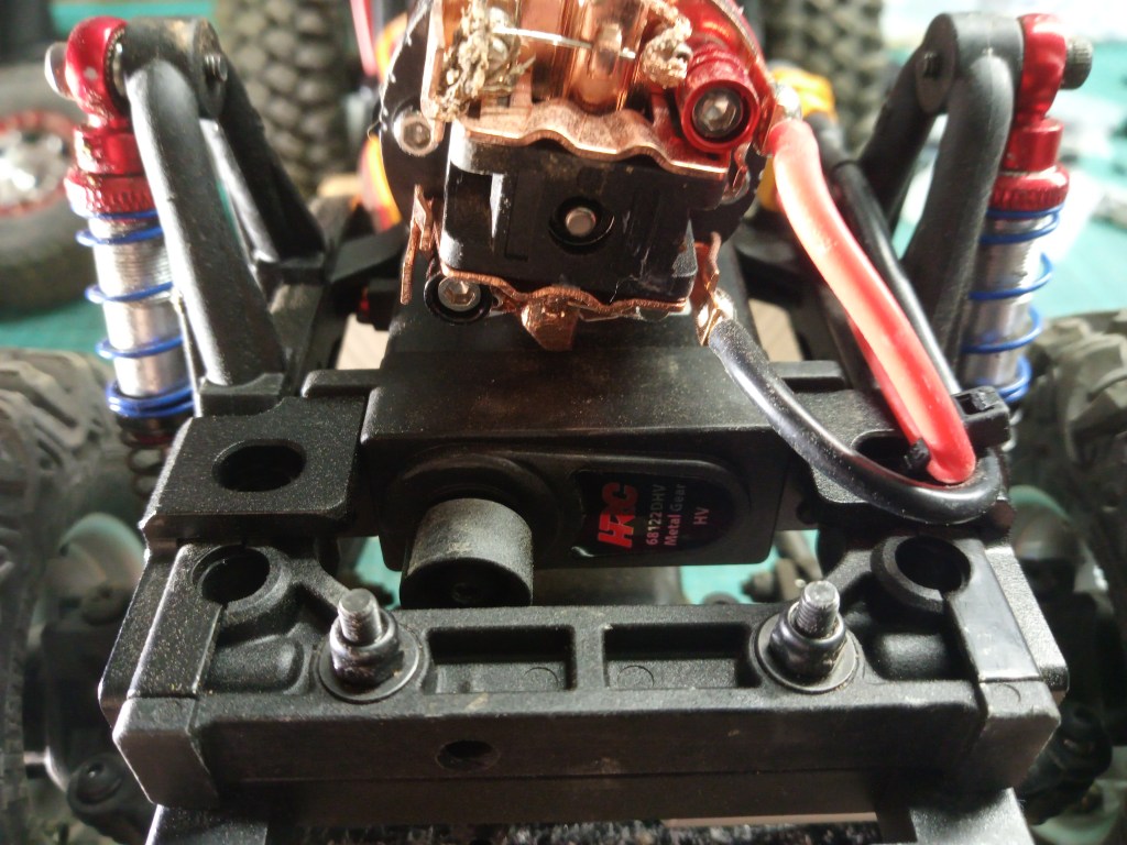 In the kit the steering servo is to be mounted on the front axle. But I didn’t want that, even though there are not only disadvantages for this mounting place. The self-steering behaviour during compression is one such example. However, since I am constantly steering in and out when driving off-road, this is negligible, but nevertheless present. By mounting the steering servo on the axle, the distances from the steering lever to the servo horn hardly change during compression and rebound. If, on the other hand, the servo is bolted to the frame, the wheels are also deflected slightly to the left when the front left is compressed. A Panhard rod could reduce this effect, but I won’t do the work this time. I’ll just countersteer harder…. 😊