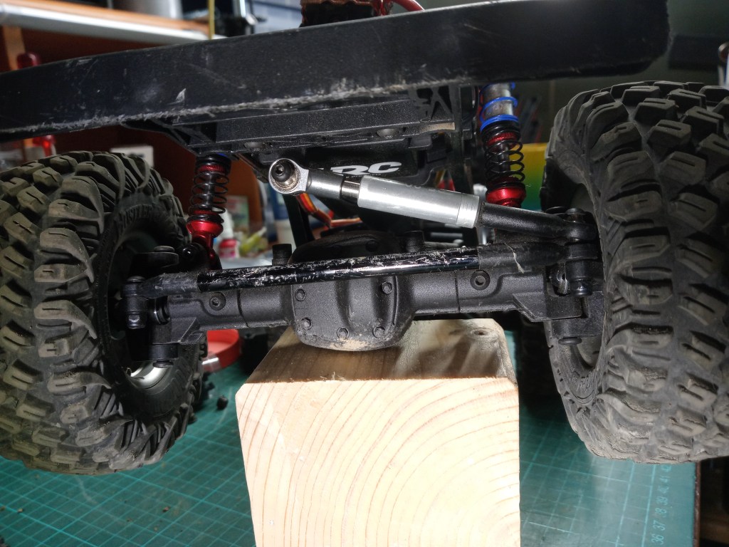 So viel zunächst von meinen ersten Gedanken, der Geschichte des Wrangler und nun wie gewohnt, wieder Technik im Detail. Ich beginne einmal mit den Änderungen am Fahrwerk selbst. Zur Wiederholung, alle Messingbuchsen in den Achslagern wurden gegen Kugellager getauscht. Das Verteilergetriebe und das Hauptgetriebe sind schon im Bausatz kugelgelagert. Die Fahrwerksstreben sind durch ein MST-Tuningkit für 242 mm Radstand aufgewertet worden. Dabei habe ich die vorderen Links gleich um 5 mm verlängert, was den Radstand auf optisch gefälligere 245 mm vergrößert. Das Vorderrad steht somit zentrierter im Radkasten.