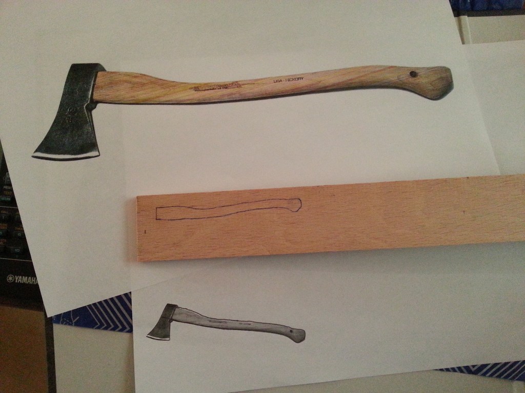 Was passiert, wenn die Bildersuche im Internet zu unvorhersehbaren Ereignissen führt, zeige ich im Folgenden. Ich bastele ja sehr gerne und lasse mich dann vom Ergebnis überraschen. Daher gleich zu den Fakten. Eine mir genehme Forstaxt wurde so auf ein maßstäbliches Verhältnis herunterskaliert und ausgedruckt. Die Druckvorlage mit Pauspapier auf eine 5mm starke Buchenleiste übertragen…