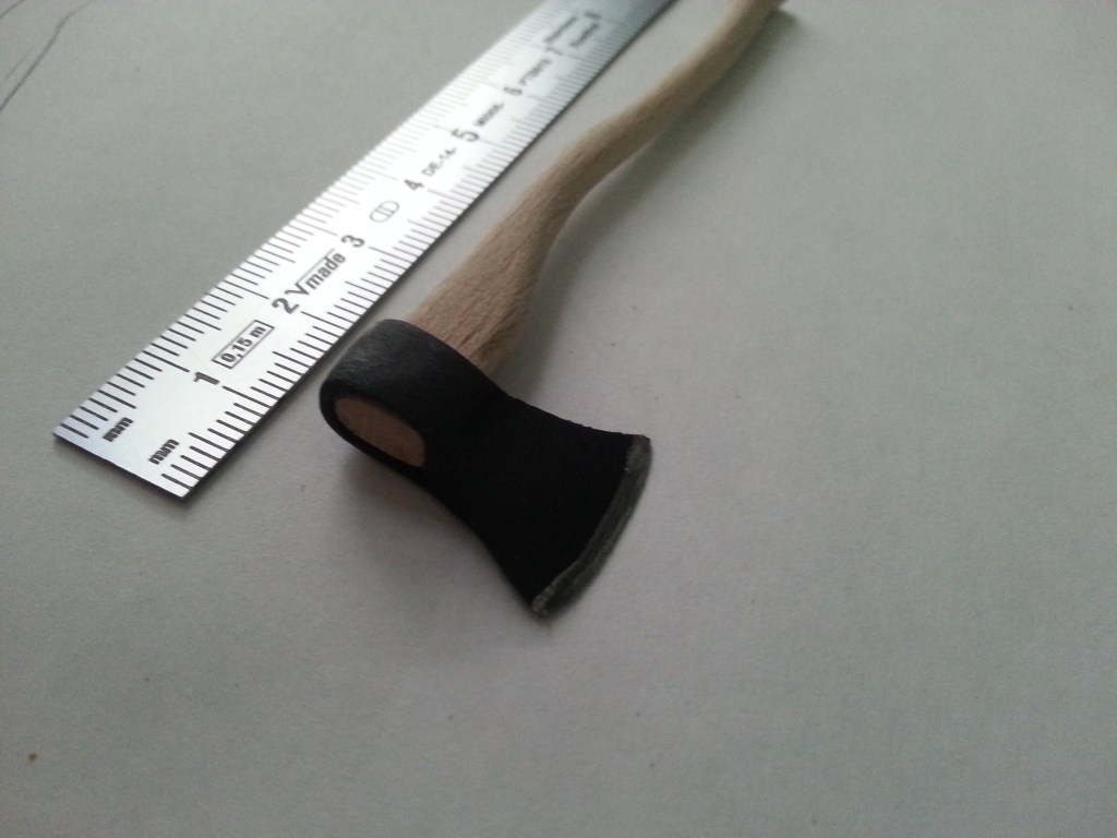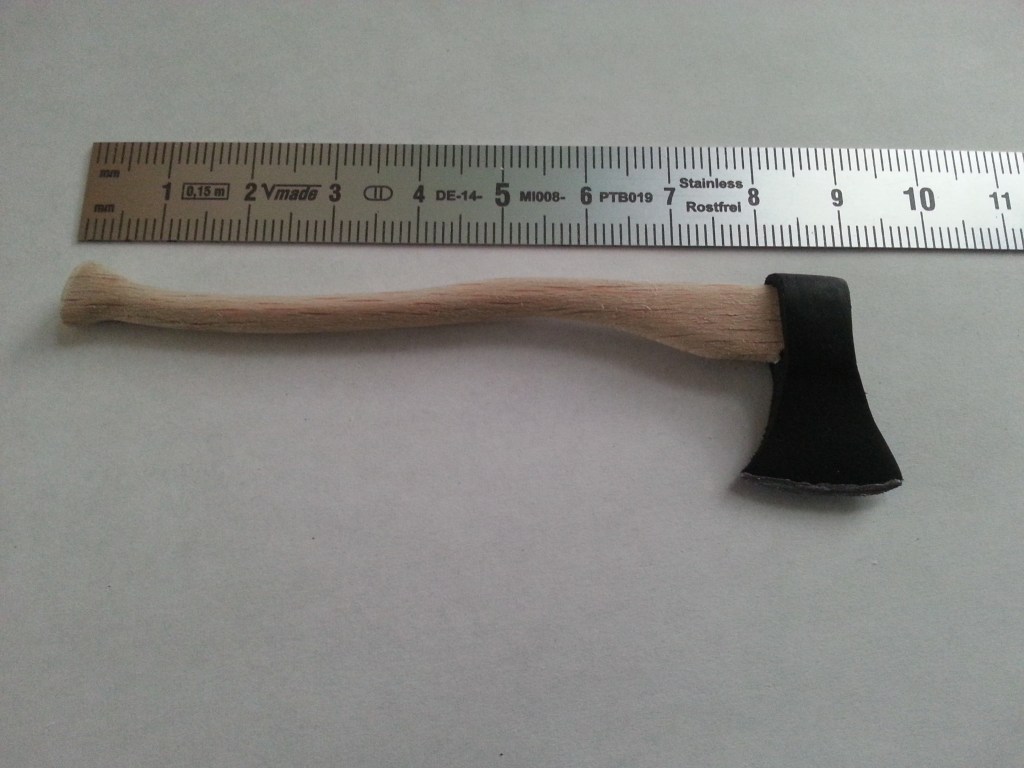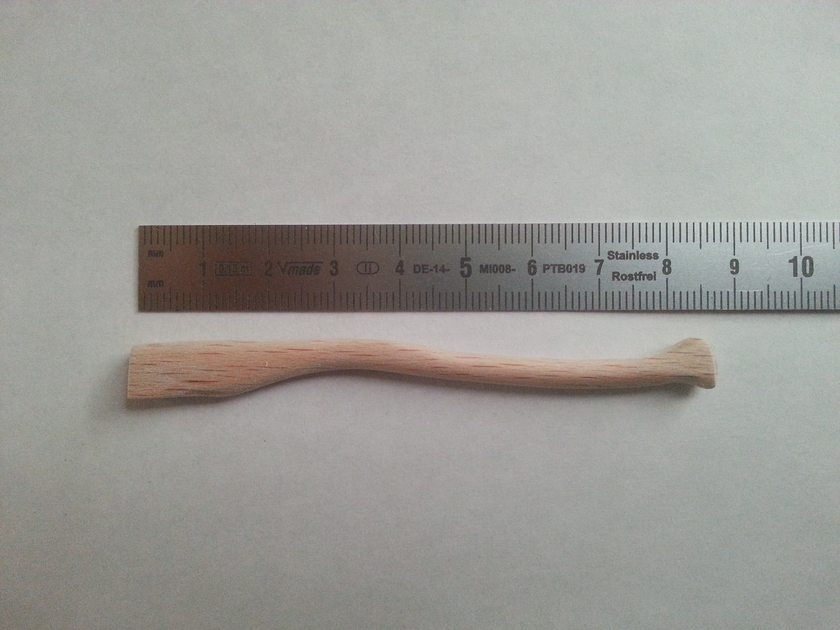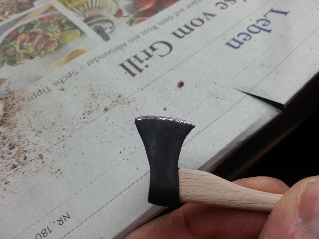 Mit dem Dremel zunächst die Konturen grob herausarbeiten und schrittweise mit Schmirgelpapier und verschiedenen Körnungen die Feinarbeit am Axtstiel. Ich habe einen Maßstab hinterlegt, damit niemand meint es wäre das Original. 😎