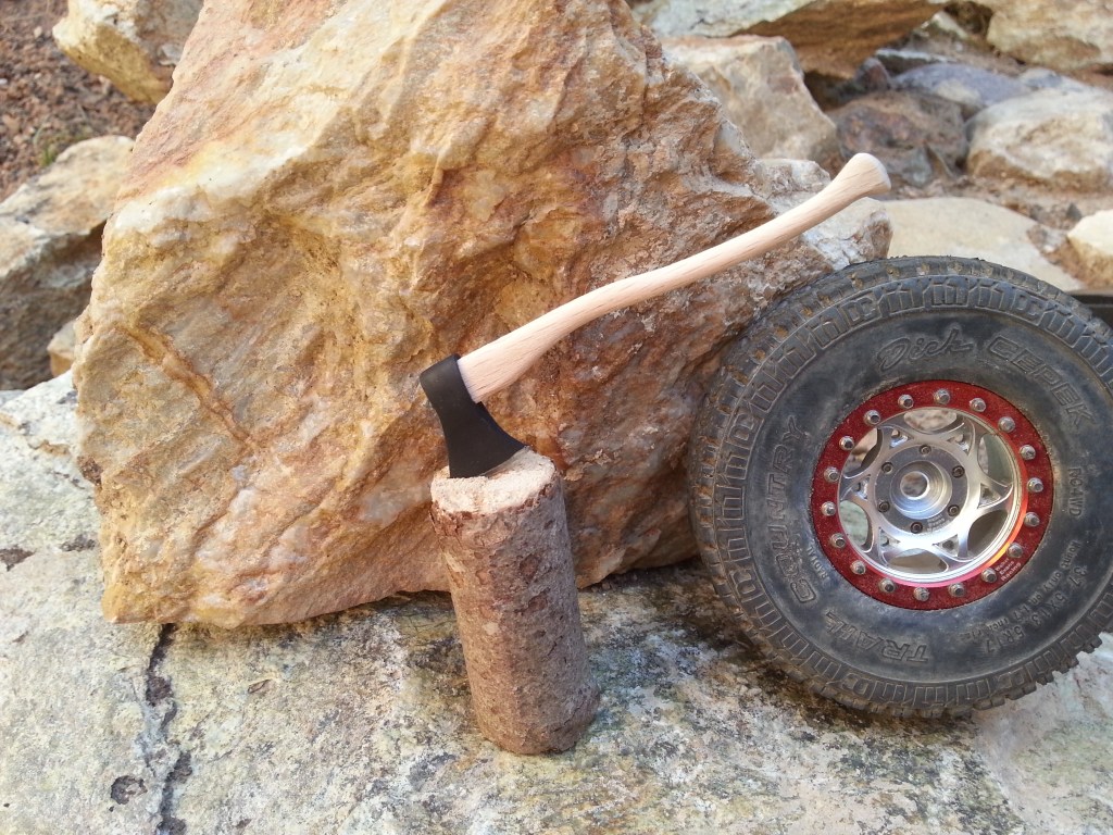 Contouring and grinding my first axe was a challenge, but the result was a surprise. A tree stump becomes the first opponent and loses. 😄