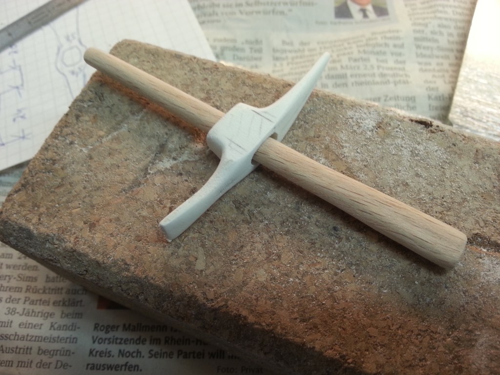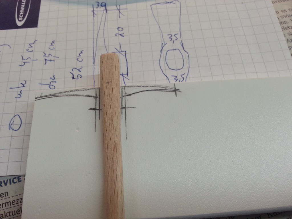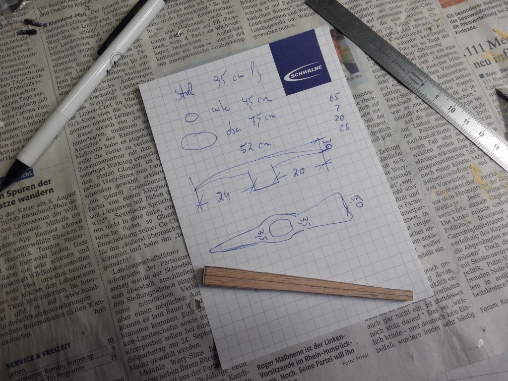 Heute nur eine kurze Einleitung, ich hatte die Baustelle ja schon im Schlusssatz der letzten Folge angekündigt. Etwas verrückt muss Mann aber schon sein und so ist es in der Tat. Mit dieser Skizze fing es diese Mal an. Den Stiel hatte ich da schon ausgesägt.
