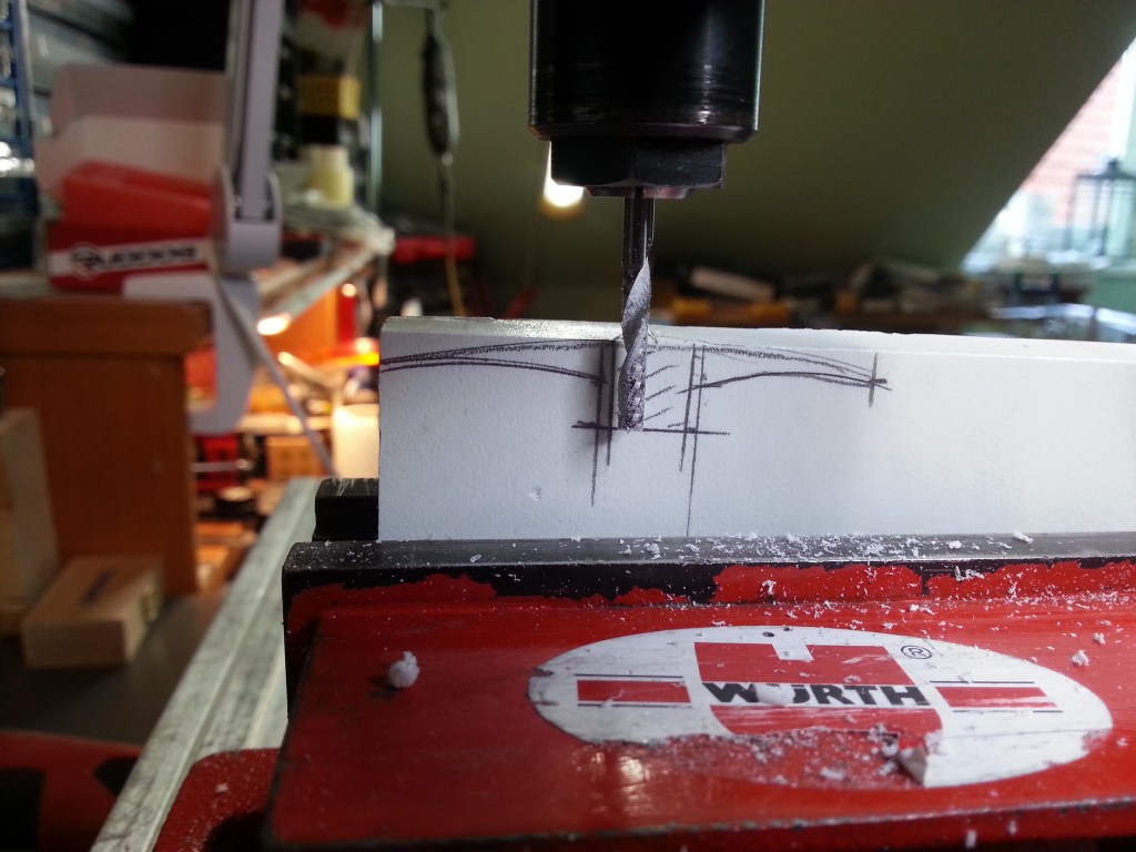 Das Bauteil etwas schräg einspannen, damit das zu bohrende Langloch auch den Winkel des Stiels bekommt.
