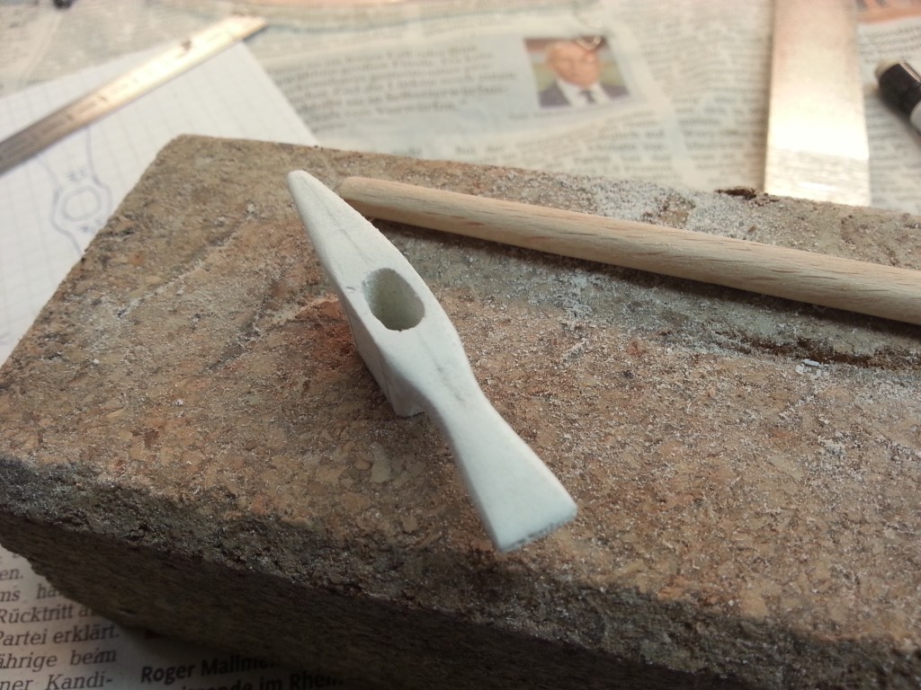 Zum Schluss musste ich aber noch einen Fehler beseitigen. Das obere Auge war minimal zu groß gefeilt und der Stiel wackelte. Mein Lösungsversuch, Kleber und Kunststoffstaub auftragen, um das Loch zu verkleinern, hatte funktioniert. 😯