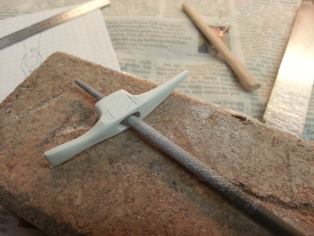 Nach guten zwei Stunden, schleife ich nur noch um die letzten Konturen zu formen. Je filigraner das gelingt, umso realistischer wird das Ergebnis. Ein guter Schlüsselfeilensatz und die noch weich, fließend geführt, runden das Bild im wahrsten Sinne des Wortes. Das zu beschreiben ist zwar möglich aber irgendwie auch wenig zielführend. Bei so kleinen Teilen einfach immer auf festen Sitz in den Fingern achten, eine gute Unterlage sicherstellen und sehr viel Geduld aufbringen. Nur kleine Arbeitsschritte ausführen und sofort das Ergebnis kontrollieren. Bei Bedarf das Bauteil umsetzen, um eine gleichmäßige Optik zu erzielen. Vor jedem Arbeitsschritt gut überlegen was zu tun.