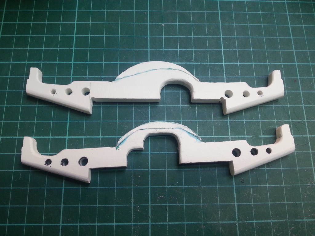 But let’s stay in order. Since I plan to be able to separate the body from the base plate, a stable support construction had to be built. Once not exactly according to the original, because then a stable but heavy base plate would be necessary to hold everything on the frame. To save weight, I only use 0.5 mm thick PS plates. Technically, however, it should look the part and so I built these two constructions. Later they sit on the frame, connected with two PS strips and these are each screwed to the side of the frame.