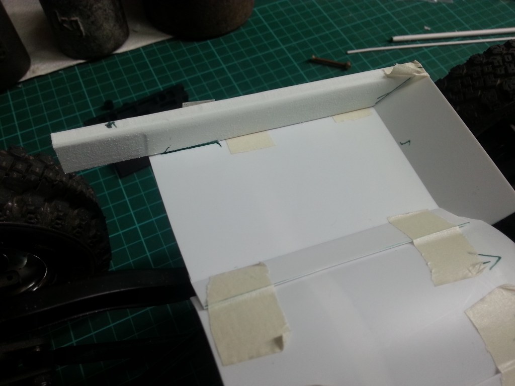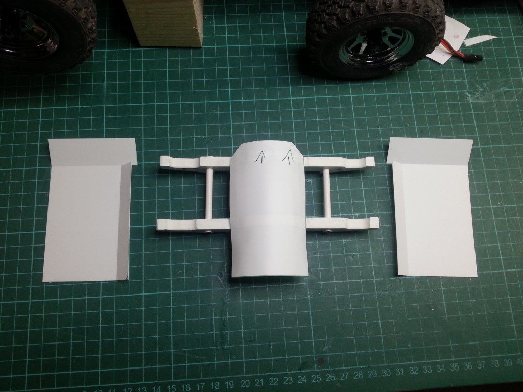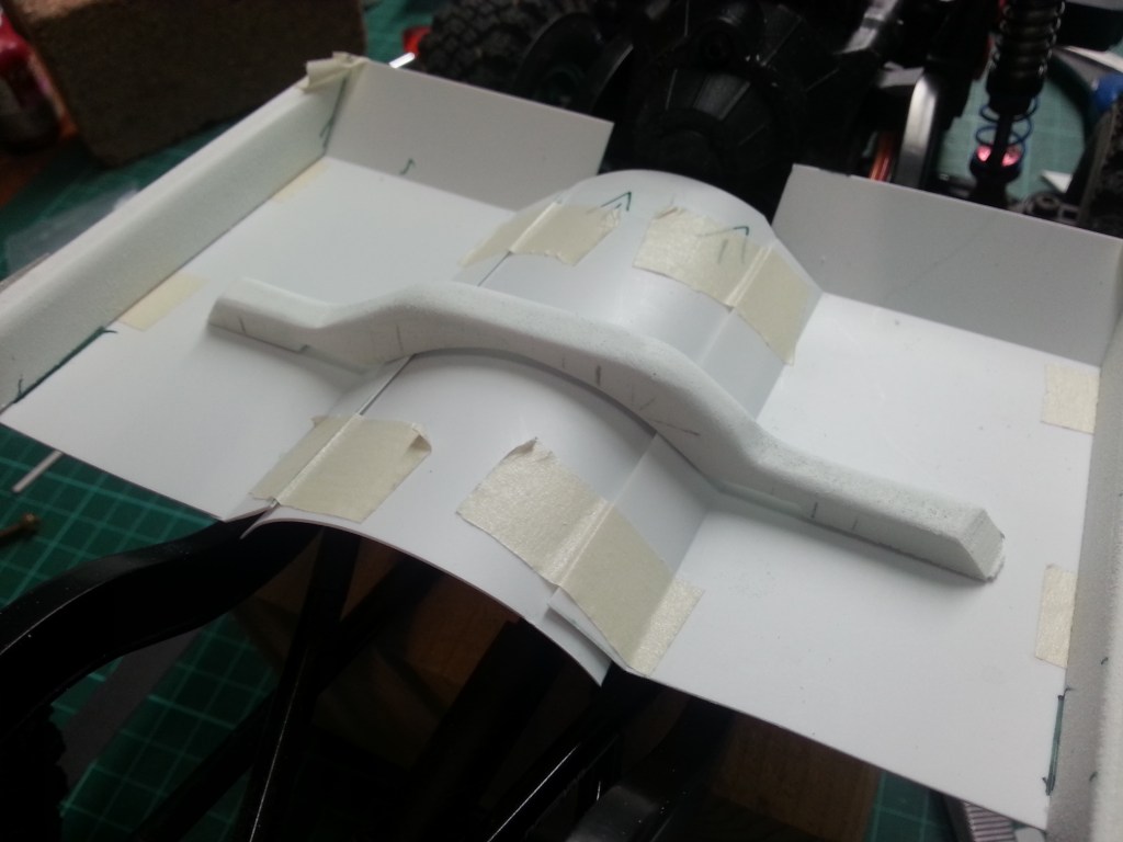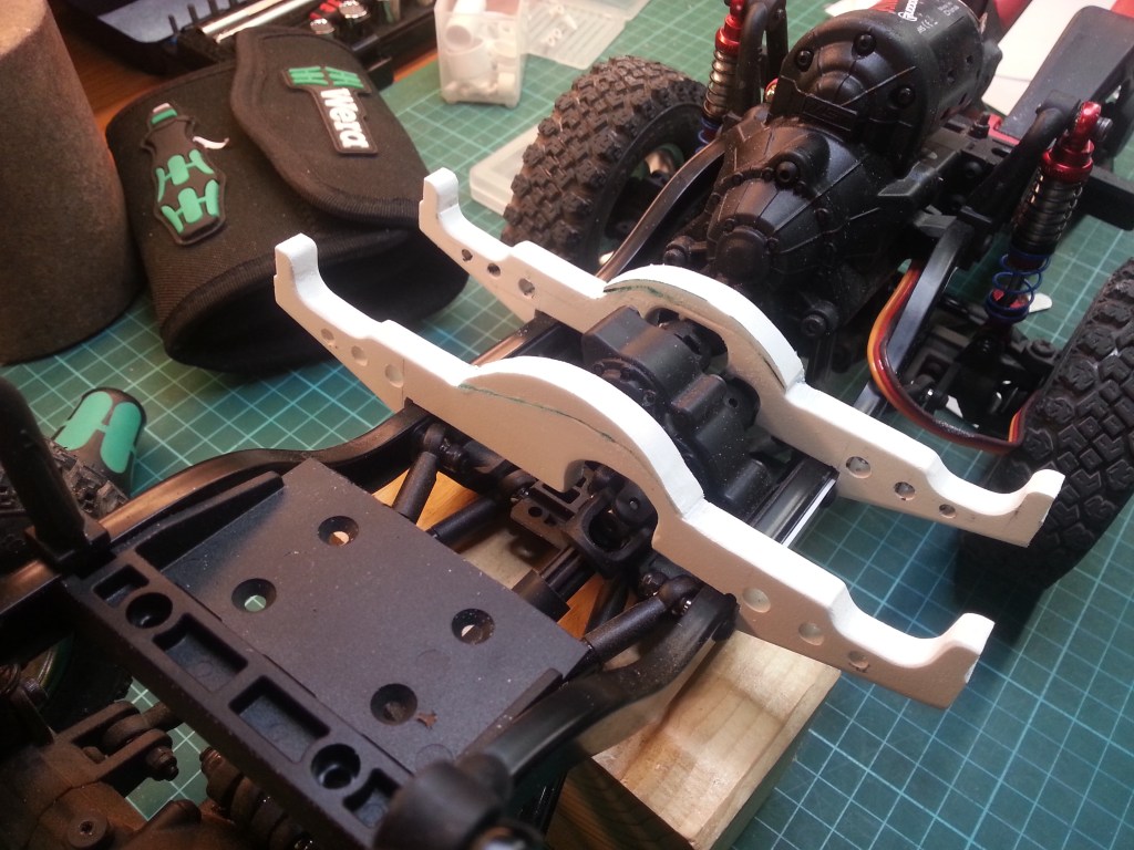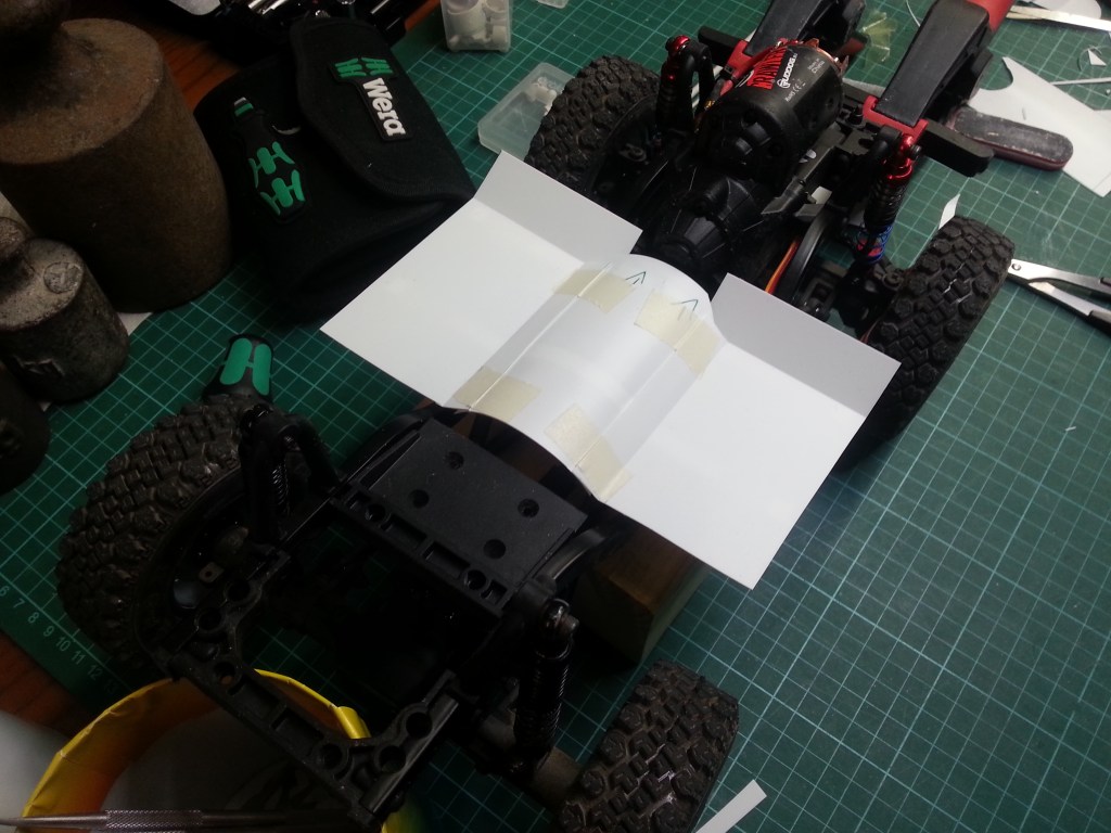 Jetzt war mein Basteltrieb völlig entfacht. Meine ursprüngliche Idee einen Straßen-Crawler zu bauen, stand auf der Kippe. Das nachfolgende Zwischenergebnis, könnte der Weg zu einem sportlichen Jeep Wrangler werden, gänzlich ohne Inneneinrichtung. Das habe ich ja auch schon beim Comanche Truggy in Arbeit. Der Reiz etwas zu bauen, was es in der Form nicht oft gibt, brennt wieder in mir…
