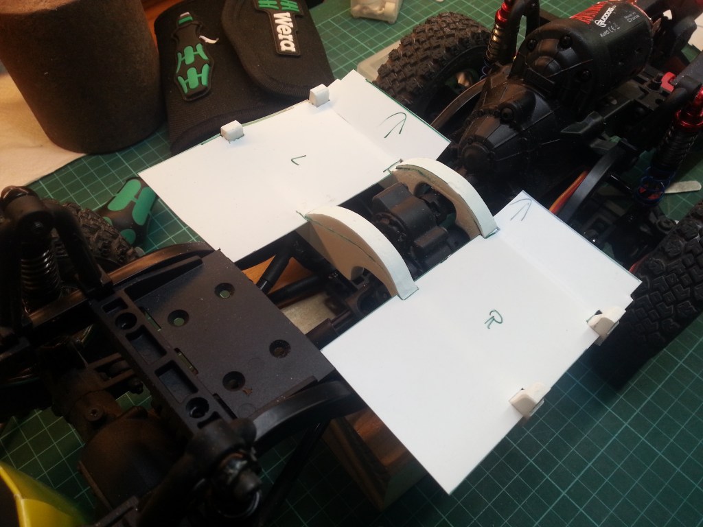 Als nächstes baue ich den hinteren Innenraum, der etwas erhöht hinter den Sitzen beginnt. Darunter, zwischen den Rahmenprofilen, habe ich die Verbindungsbrücke zwischen den Stoßdämpferdomen entfernt. Hier kann nur ein kompaktes Akku untergebracht werden. Ein Shorty Akkupack in 2s Ausführung, mehr ist platztechnisch ohne Verlust meines geliebten Innenraums, nicht unterzubringen.