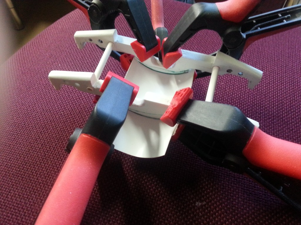 The cladding of the gimbal tunnel was the next construction step. Even 0.5 mm thin PS sheets have a momentum of their own and had to be held in place with clamps. I put two 5 mm PS tubes into the subframe beforehand as spacers to stabilise the construction.