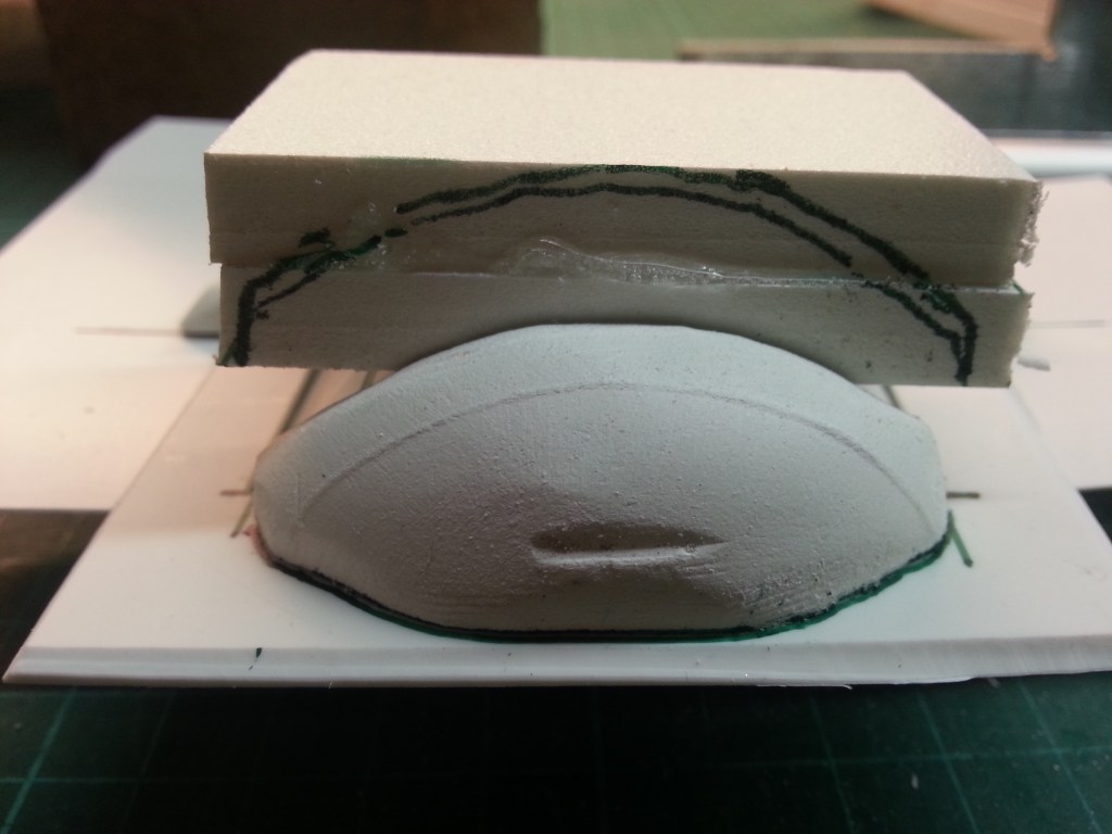 An diesem Punkt ist dann eine Entscheidung gefallen. Die bisherige Baustrategie scheint zu funktionieren. Forex-Platten in der benötigten Stärke und Größe zusammenkleben und dreidimensional bearbeiten. Daher wieder einmal lange gebaut und doch wieder verworfen. Aus vielen Einzelteilen und einer Woche Arbeit entstand schließlich ein neues Ergebnis. Eine Bodenplatte aus dem Vollen gefräst und geschliffen. Basis war eine 10 mm starke Forex-Platte. Ich war mit dem Bauen derart beschäftigt und angespannt, dass leider keine Detailbilder während des Bauens entstanden sind. Sie folgen aber dem Muster wie eingangs beschrieben und dokumentiert. Daher das vorläufige Ergebnis in Kurzform…🤷♂️