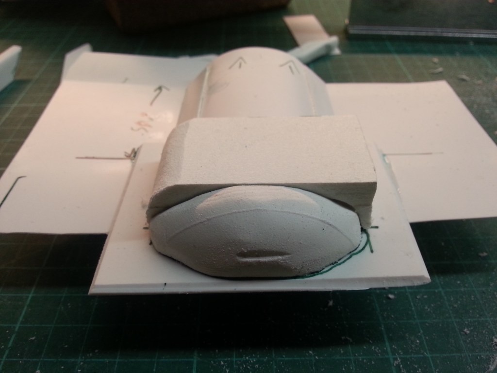 At this point a decision was made. The previous building strategy seems to work. Gluing together forex panels in the required thickness and size and working them three-dimensionally. So once again I built for a long time and then discarded it. Finally, a new result emerged from many individual parts and a week’s work. A base plate milled from the solid and sanded. The basis was a 10 mm thick forex plate. I was so busy and tense with the building that unfortunately no detailed pictures were taken during the construction. But they follow the pattern as described and documented at the beginning. Here is the preliminary result in short form…🤷♂️