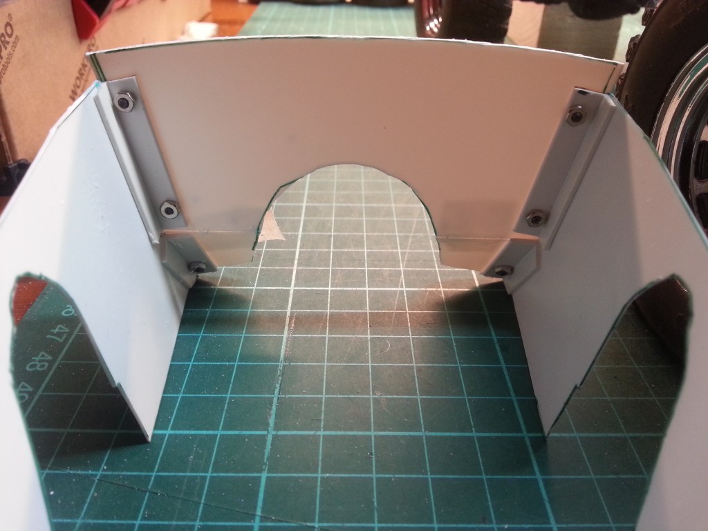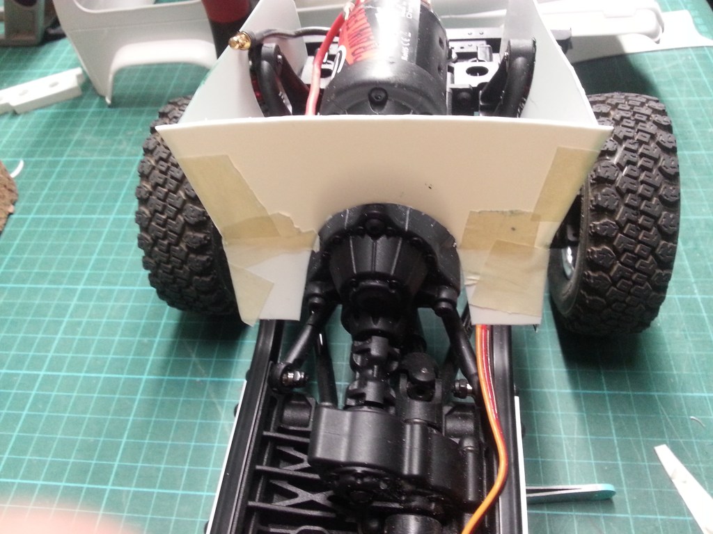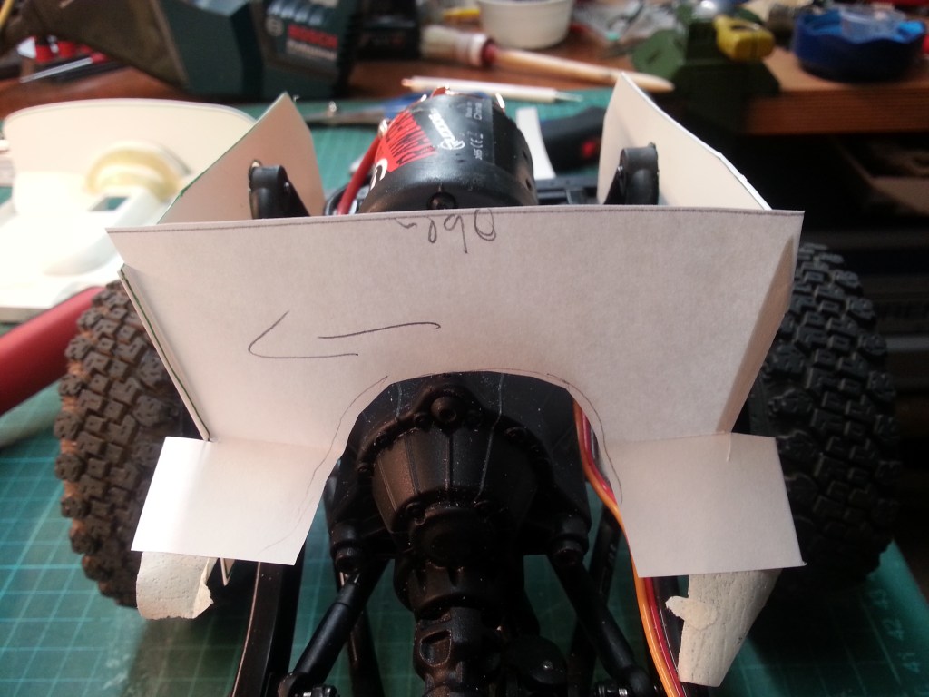 Nachdem die Karosserie endlich ihren Platz und Höhenlage gefunden hatte, musste zuerst der spätere Standort für Empfänger und Fahrtregler gebaut werden. Das wäre in diesem Fall der Motorraum. Ist der Vorderwagen stabilisiert, kann auch der Heckbereich fixiert werden. Um die sehr dünnen Seitenteile aus 0,5 mm PS-Platten etwas widerstandsfähiger zu bekommen, habe ich noch eine Rückwand aus einer 1,0 mm PS-Platte gebaut, wieder durch eine Vorlage aus Papier.