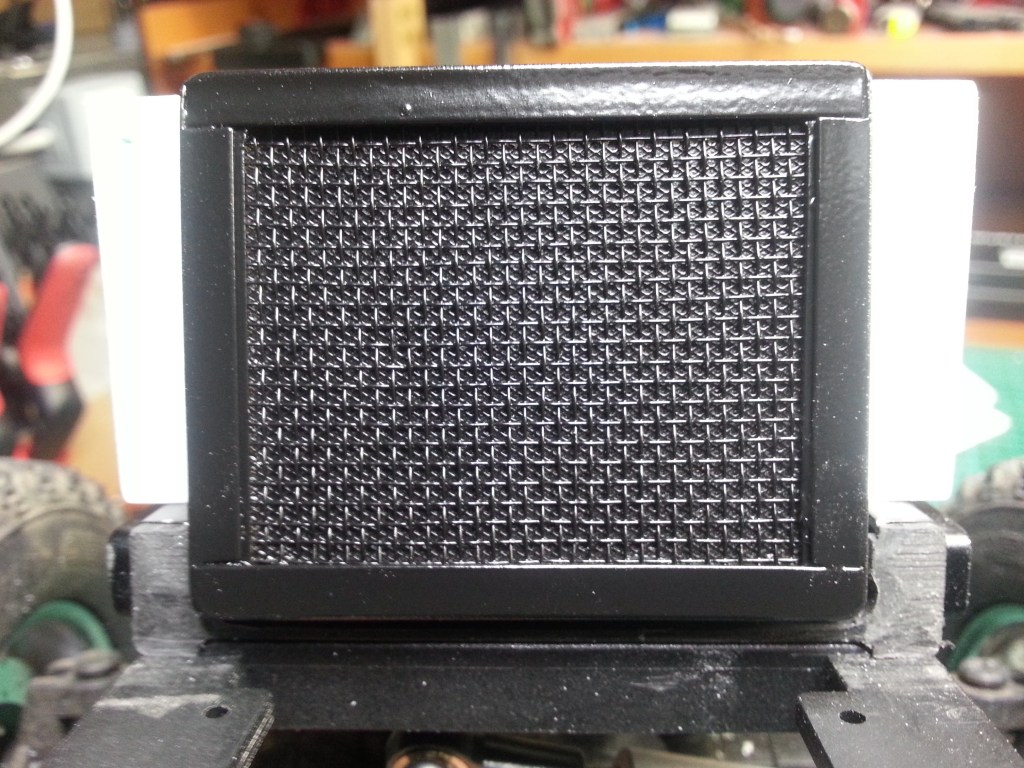 Diese Hilfskonstruktion wird vor den Halteblock montiert und stellt die Kühlerattrappe dar. Eine PS-Platte 0,5 mm, darauf ein Diagonallochblech in Messing, eine Lage Drahtgitter, eingefasst von einem PS-Rahmen und alles gerahmt mit einem PS-Winkel.