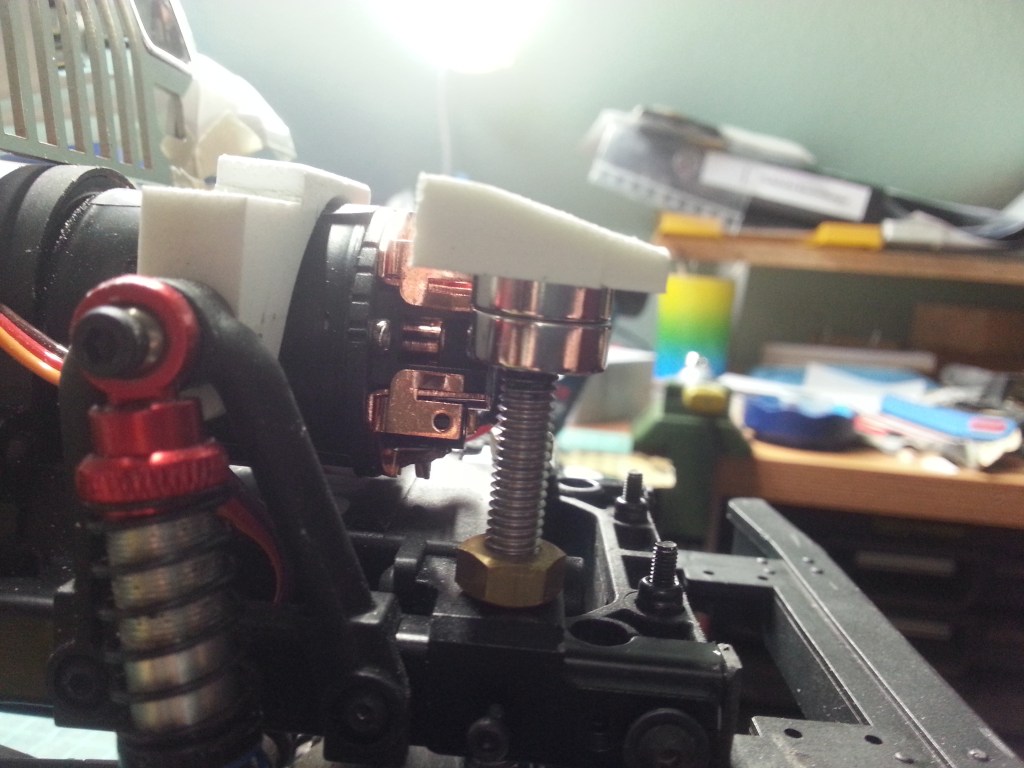The front magnet fastening; two M6 threaded rods, with a 3mm hole and thread, are used as supports for the magnets. This way I can vary the height of the body to the chassis within limits.